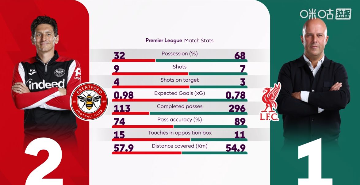 आधे समय के आंकड़ों के संदर्भ में, लिवरपूल के पास ड्रिब्लिंग, पासिंग और रिसीविंग आदि में स्पष्ट बढ़त है, लेकिन गोल की संख्या, गोल पर शॉट्स की संख्या और तीन-सेकंड क्षेत्र में टच की संख्या के मामले में यह अपने विरोधियों से पीछे है। और खेल के दौरान, ब्रेंटफोर्ड की मजबूत गोलकीपर थ्रोइंग रणनीति ने लिवरपूल को कई बार धमकी दी और परिणामस्वरूप शुरुआती चरण में पहला गोल हुआ।