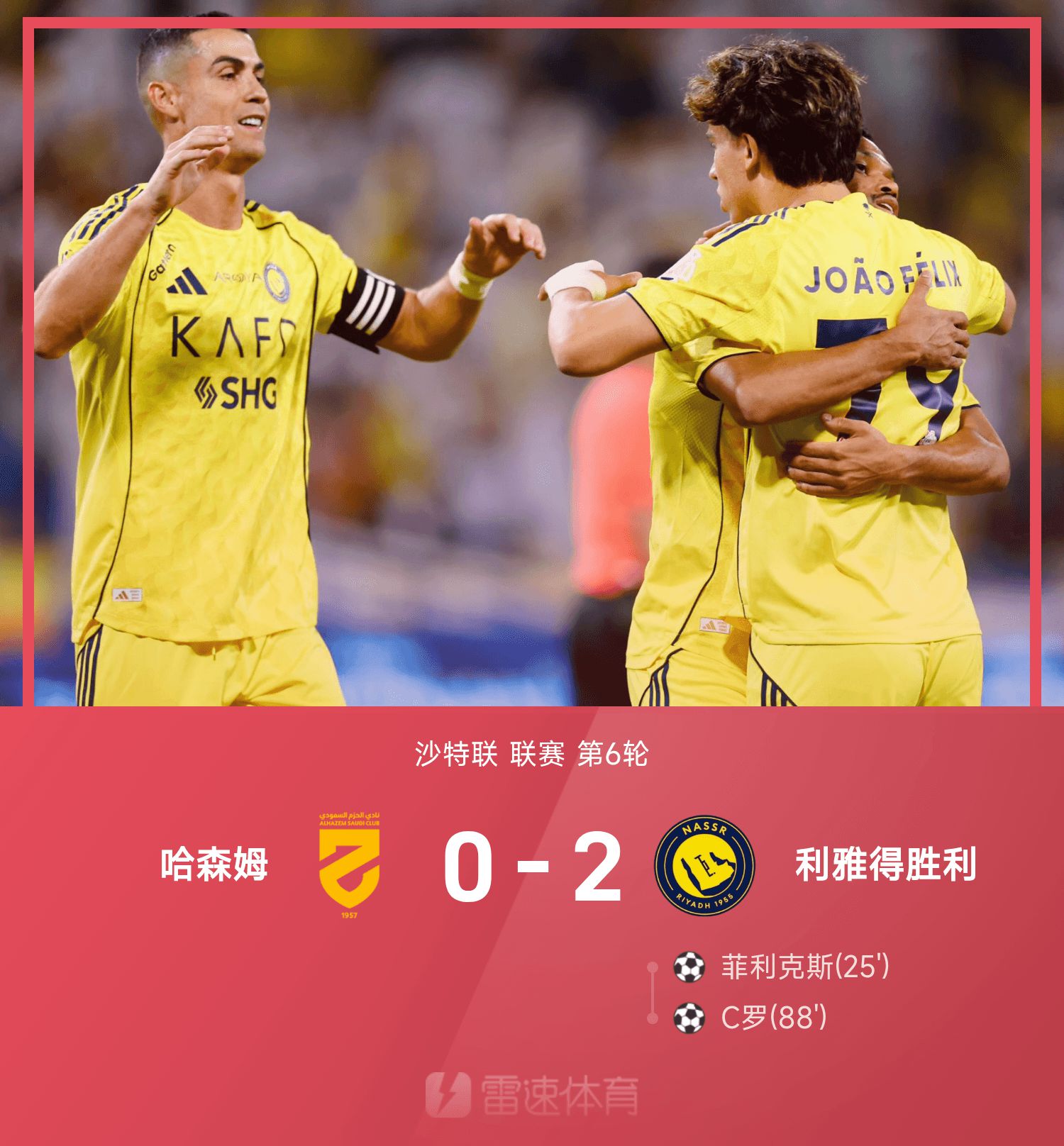 6686 स्पोर्ट्स, 26 अक्टूबर, 25/26 सऊदी लीग के छठे दौर में, रियाद ने हाशेम को 2-0 से हराया। पहले हाफ में फेलिक्स ने गतिरोध तोड़ने के लिए गेंद को हेड किया। दूसरे हाफ की समाप्ति से पहले रोनाल्डो के लॉब शॉट ने जीत पक्की कर दी। अंत में, रियाद ने हाशेम के खिलाफ विरोधी टीम को 2-0 से हरा दिया और लगातार 6 लीग मैच जीते।