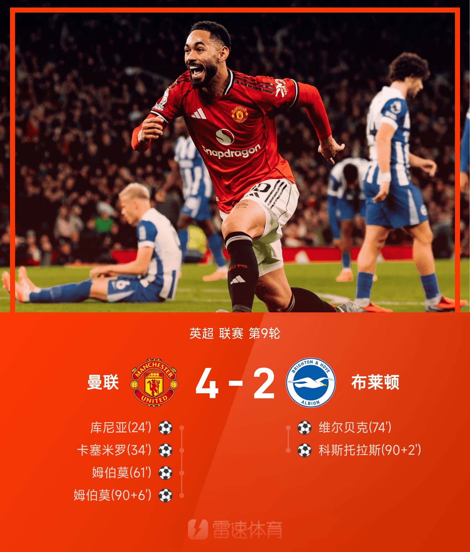 6686 स्पोर्ट्स 26 अक्टूबर 25/26 प्रीमियर लीग सीज़न के नौवें दौर में, मैनचेस्टर यूनाइटेड ने घरेलू मैदान पर ब्राइटन का सामना किया। शुरुआती चरण में दोनों टीमों ने आक्रमण और रक्षा का आदान-प्रदान किया और एक ही मिनट में गतिरोध टूट गया। कासेमिरो ने गोल किया और कुन्हा ने मैनचेस्टर यूनाइटेड में शामिल होने के बाद तीन-सेकंड क्षेत्र के बाहर से एक शॉट के साथ अपना पहला गोल किया। 10वें मिनट में, कासेमिरो के बाहरी शॉट को डिफेंडर ने नेट में डाल दिया और मैनचेस्टर यूनाइटेड ने 2-0 की बढ़त के साथ हाफटाइम ब्रेक में प्रवेश किया।