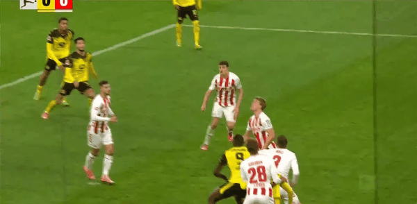 10' डॉर्टमुंड की अग्रिम पंक्ति की गेंद ने अराजकता पैदा कर दी, एंटोन ने निकट सीमा से दूर कोने को धक्का दिया और अंतिम पंक्ति से अवरुद्ध कर दिया गया