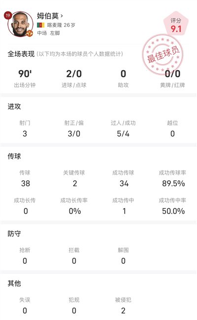ब्राइटन के विरुद्ध एमबीमो के पूरे गेम आँकड़े: दो बार स्कोर किया, पासिंग सफलता दर 89.5%