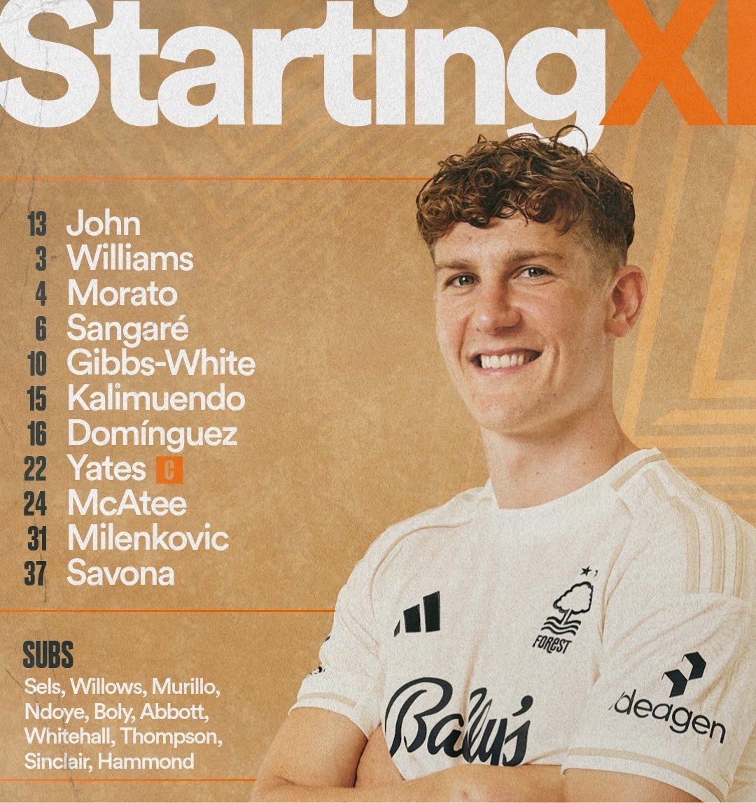 नॉटिंघम फ़ॉरेस्ट शुरुआती लाइनअप: 13-विक्टर, 31-मिलेंकोविक, 3-विलियम्स, 4-मोराटो, 37-सवोना, 6-संगारे, 22-येट्स, 10-व्हाइट, 16-डोमिंगुएज़, 24-मैक्कार्टी, 1 5-कैली मुएन्डो