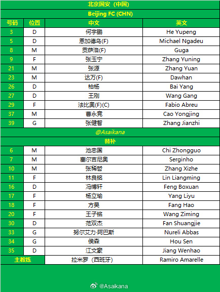 बीजिंग गुओन शुरुआती लाइनअप:39-झांग जियानझी, 3-हे युपेंग, 5-नगादेवू, 26-बो यांग, 27-वांग गैंग, 8-गुजिया, 21-झांग युआन, 23-दावान, 37-काओ योंगजिंग, 9-झांग युनिंग, 29-फैबियो