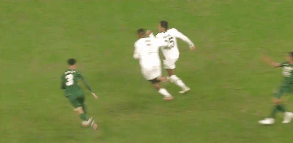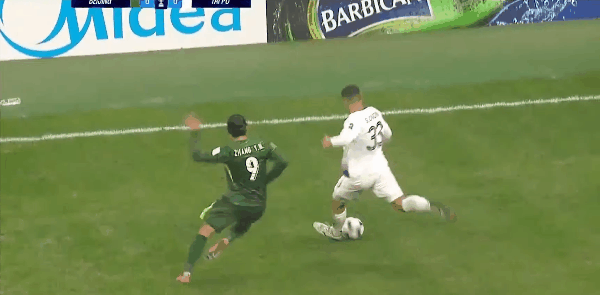 42' झांग युनिंग को अपने प्रतिद्वंद्वी द्वारा अपने क्रॉच के नीचे ड्रिब्लिंग करने से अपमानित होना पड़ा, फैबियो ने प्रतिद्वंद्वी को धक्का दिया टीम के साथी