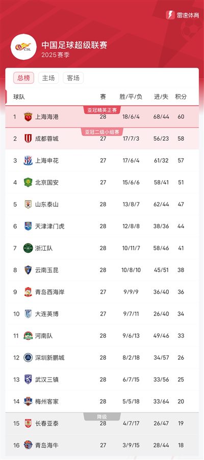 चीनी सुपर लीग के वास्तविक समय अंक: हैगांग 2 अंक आगे है, अगर चेंगदू जीतता है तो सूची में शीर्ष पर पहुंच जाएगा, शेनहुआ अस्थायी रूप से तीसरे स्थान पर है