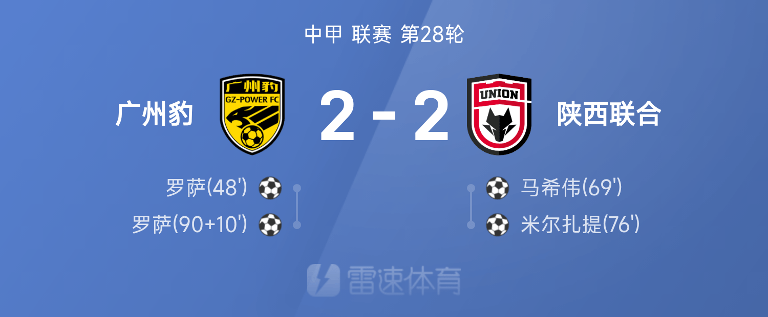 6686 खेल 26 अक्टूबर 25वीं चीनी लीग वन के 28वें दौर में, गुआंगज़ौ लेपर्ड्स ने शानक्सी यूनाइटेड के साथ 2-2 से ड्रॉ खेला। पूरे खेल में, रोज़ा ने दो बार स्कोर किया, जबकि मा ज़िवेई और मिर्ज़ाती ने स्कोर किया।