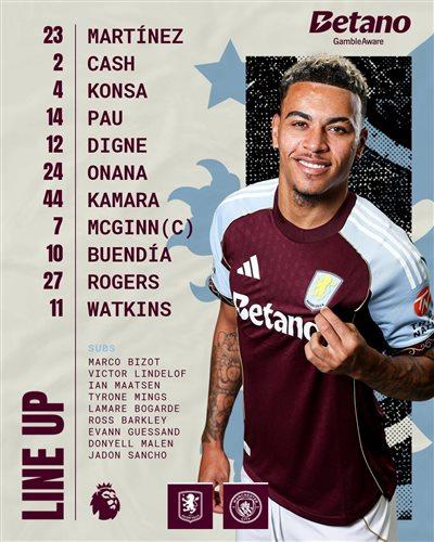 एस्टन विला की शुरुआती लाइनअप: 23-मार्टिनेज, 12-डिग्ने, 4-कोन्सा, 2-काश, 14-टोरेस, 7-मैकगिन, 10-ब्यूंडिया, 44-कामारा, 24-ओनाना, 27-रोजर्स, 11-वॉटकिंस