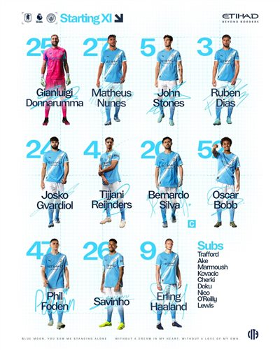मैनचेस्टर सिटी शुरुआती लाइनअप: 25-डोनारुमा, 5-स्टोन्स, 3-डायस, 27-नुनेज़, 24-ग्वादिओल, 20-बी सीट, 47-फोडेन, 4-रेइंडर्स, 26-सविन्हो, 52-बॉब, 9-हालैंड