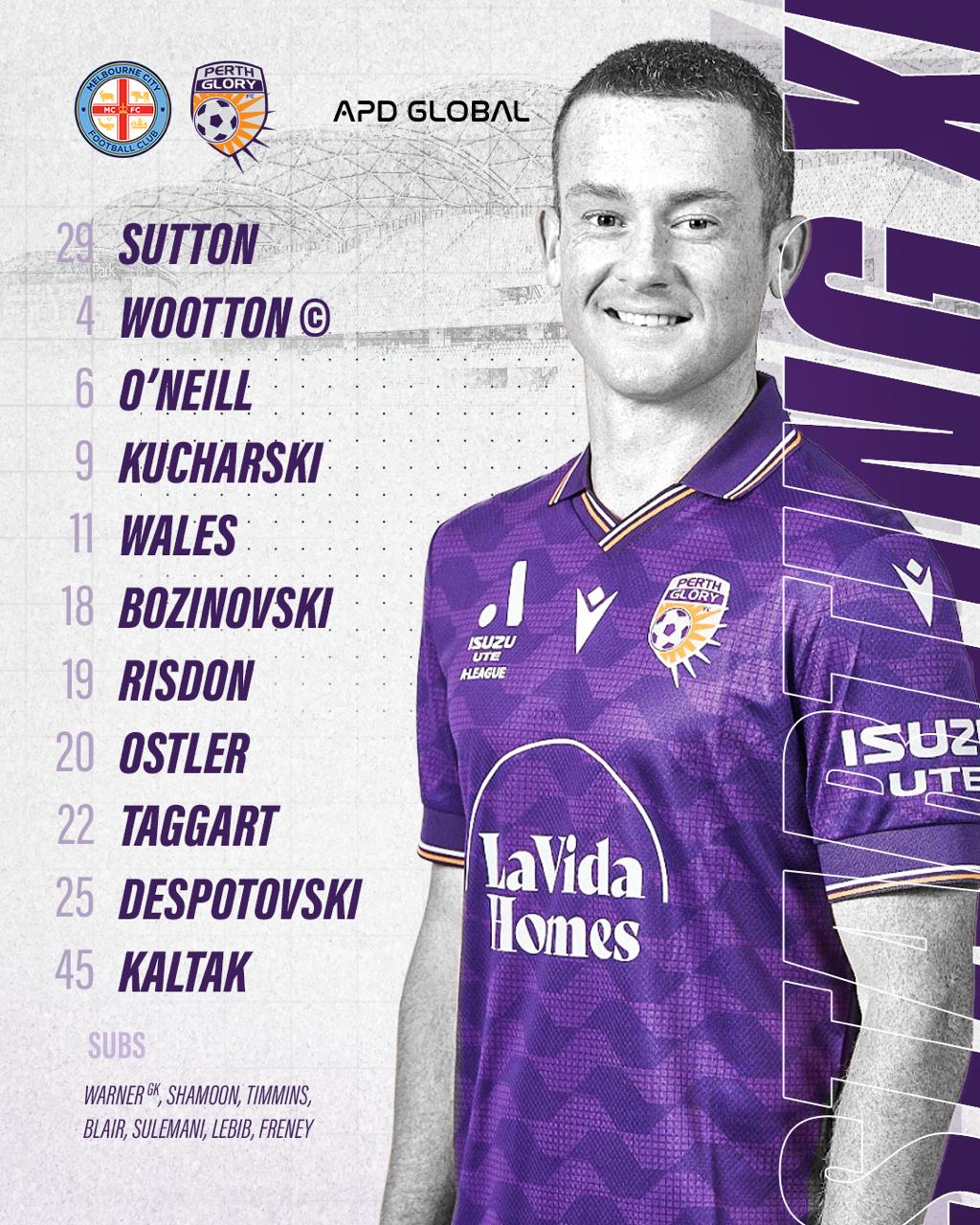 पर्थ ग्लोरी शुरुआती लाइनअप: 29-सटन, 19-रिसडेन, 4-वूटन, 11-वेल्स, 45-कार्ल टकर, 20-ओस्टरलर, 6-ओ'नील, 9-कुचलस्की, 18-बोज़्नोव्स्की, 2 5-डेस्पोटोव्स्की, 22-टैगगार्ट