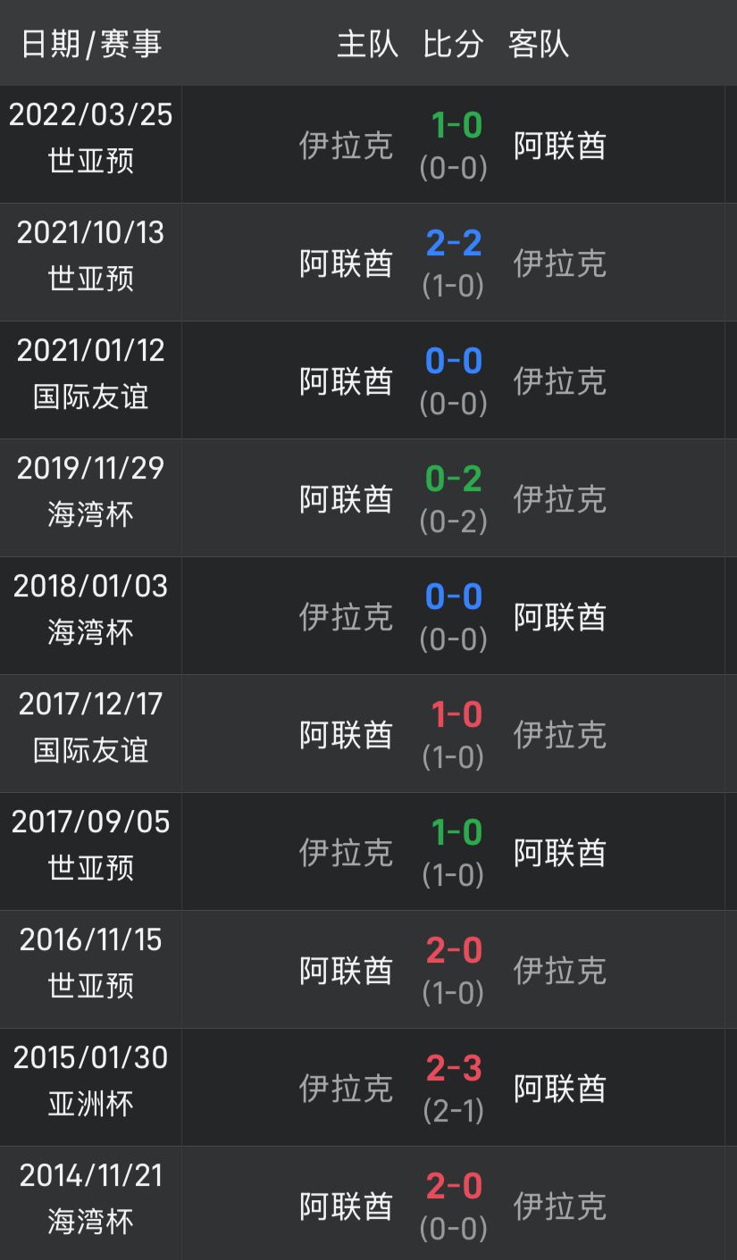 डेटा से पता चलता है कि यूएई ने पिछले 10 बार इराक के खिलाफ खेला है, जिसमें 4 जीत, 3 ड्रॉ और 3 हार का रिकॉर्ड है, 10 गोल किए हैं और 8 गोल खाए हैं। हालाँकि ऐसा लगता है कि यूएई को थोड़ा फायदा है, दोनों पक्षों के बीच पिछले 5 मैचों में, यूएई ने 3 ड्रॉ और 2 हार दर्ज की है, और 4 बार हार का सामना करना पड़ा है।