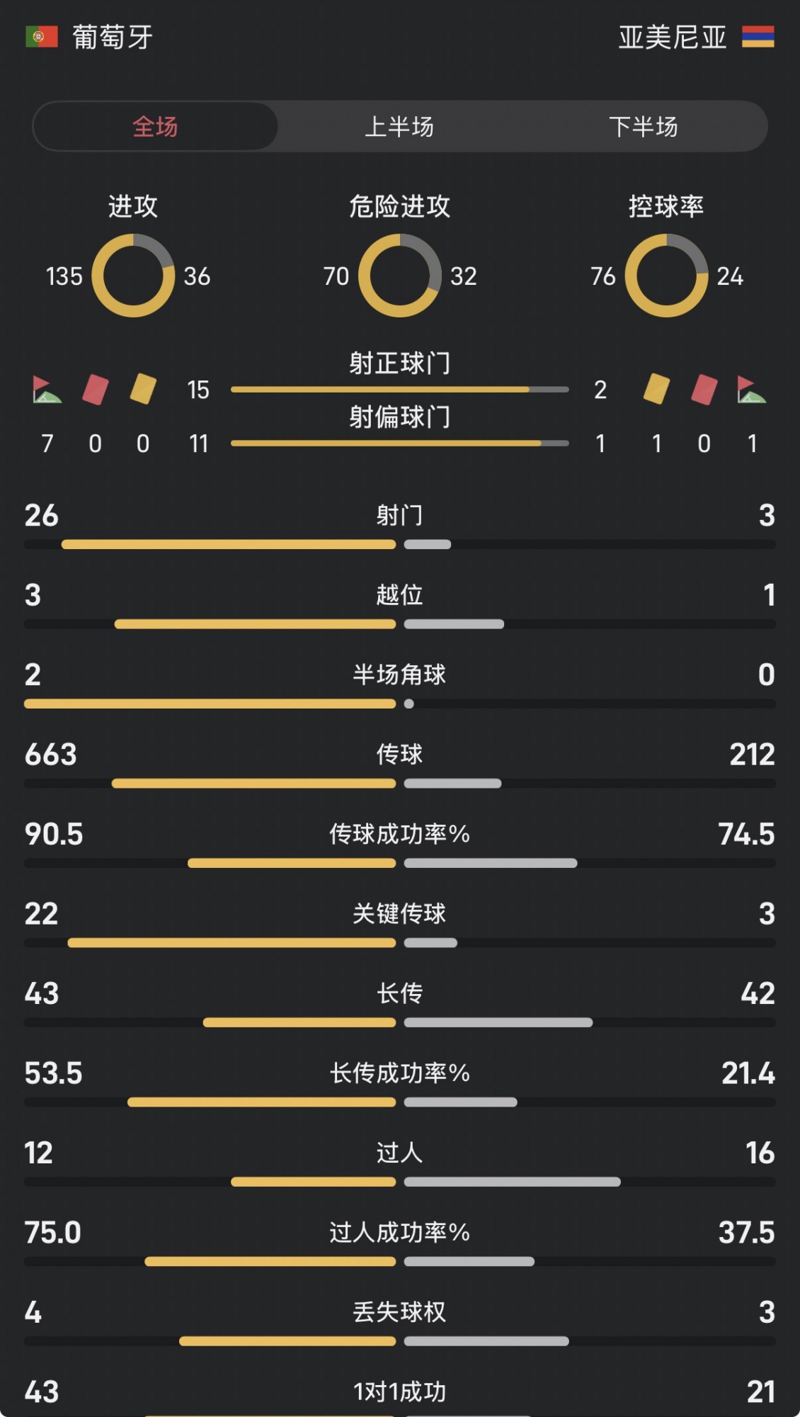 पुर्तगाल और आर्मेनिया के बीच पूरे खेल के आँकड़े: ड्रिब्लिंग दर 76-24, गोल स्कोरिंग 26-3
