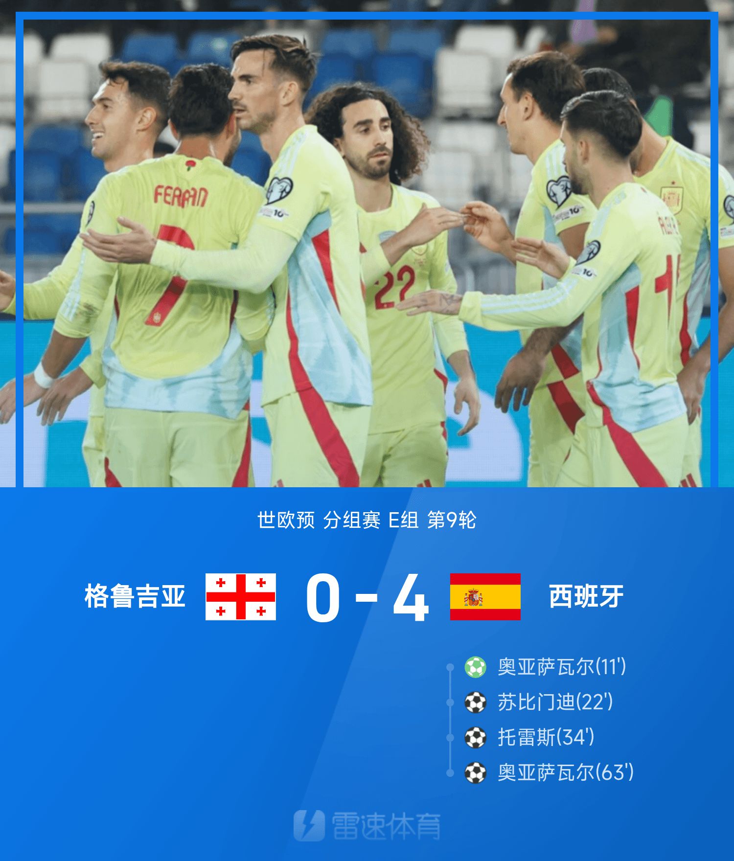 6686 स्पोर्ट्स ने 16 नवंबर को रिपोर्ट दी कि विश्व यूरोपीय प्रारंभिक के ग्रुप ई के 9वें दौर में, जॉर्जिया ने स्पेन के खिलाफ घरेलू टीम के रूप में खेला। इस अभियान के पहले भाग में, ओयारज़ाबल ने 12-यार्ड पेनल्टी के साथ स्कोरिंग की शुरुआत की, सुबिमेंडी ने एक शॉट से स्कोर किया, और टोरेस को गोल के सामने एक क्रॉस पास मिला और दूर कोने में धकेल दिया गया। पक्ष बदलने और फिर से लड़ने के बाद, ओयारज़ाबल को टोरेस से एक पास मिला और पेनल्टी क्षेत्र में स्कोर किया। खेल समाप्त हुआ, स्पेन 4-0 जॉर्जिया। इस राउंड के बाद स्पेन 15 अंकों के साथ ग्रुप में पहले स्थान पर रहा और तुर्किये 12 अंकों के साथ ग्रुप में दूसरे स्थान पर रहा। फाइनल राउंड में दोनों टीमें भिड़ीं।