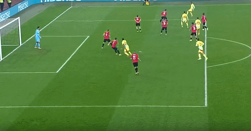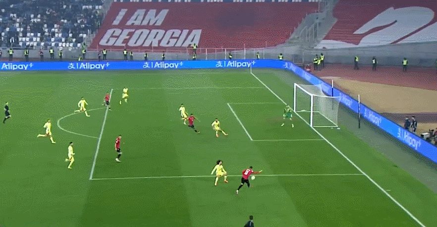 79' तिताइशविली ने तीन-सेकंड क्षेत्र के बाहर से एक शॉट लिया, और गेंद क्रॉसबार के ऊपर से उड़ गई और अंत से बाहर चली गई लाइन