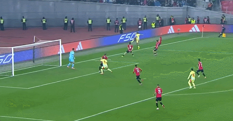 86' स्पैनिश डिफेंडर ने शॉट को रोका और पेनल्टी क्षेत्र को पार कर लिया और लगभग अपना ही गोल कर दिया, और गेंद पोस्ट से टकराकर बाहर निकल गई