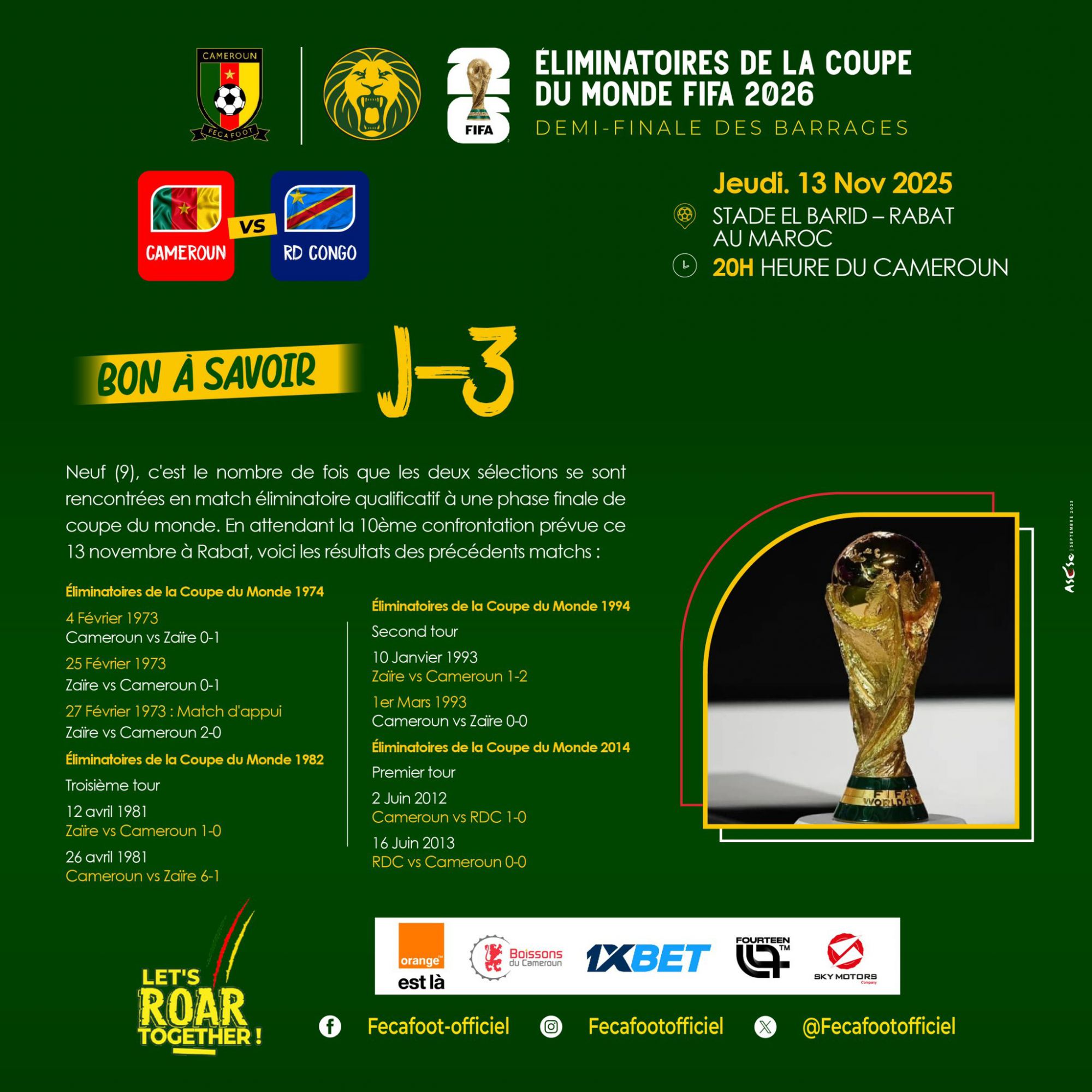 14 नवंबर को सुबह 3:00 बजे, बीजिंग समय, 2026 यूएस-मेक्सिको विश्व कप क्वालीफाइंग टूर्नामेंट के अफ्रीकी क्वालीफाइंग प्ले-ऑफ में, कैमरून और कांगो लोकतांत्रिक गणराज्य अल्बारी डर्बी स्टेडियम में प्रतिस्पर्धा करेंगे। मोरक्को. इस खेल का विजेता अफ्रीका में एकमात्र अंतरमहाद्वीपीय प्ले-ऑफ टिकट के लिए गैबॉन और नाइजीरिया के बीच दूसरे खेल के विजेता के साथ प्रतिस्पर्धा करेगा।