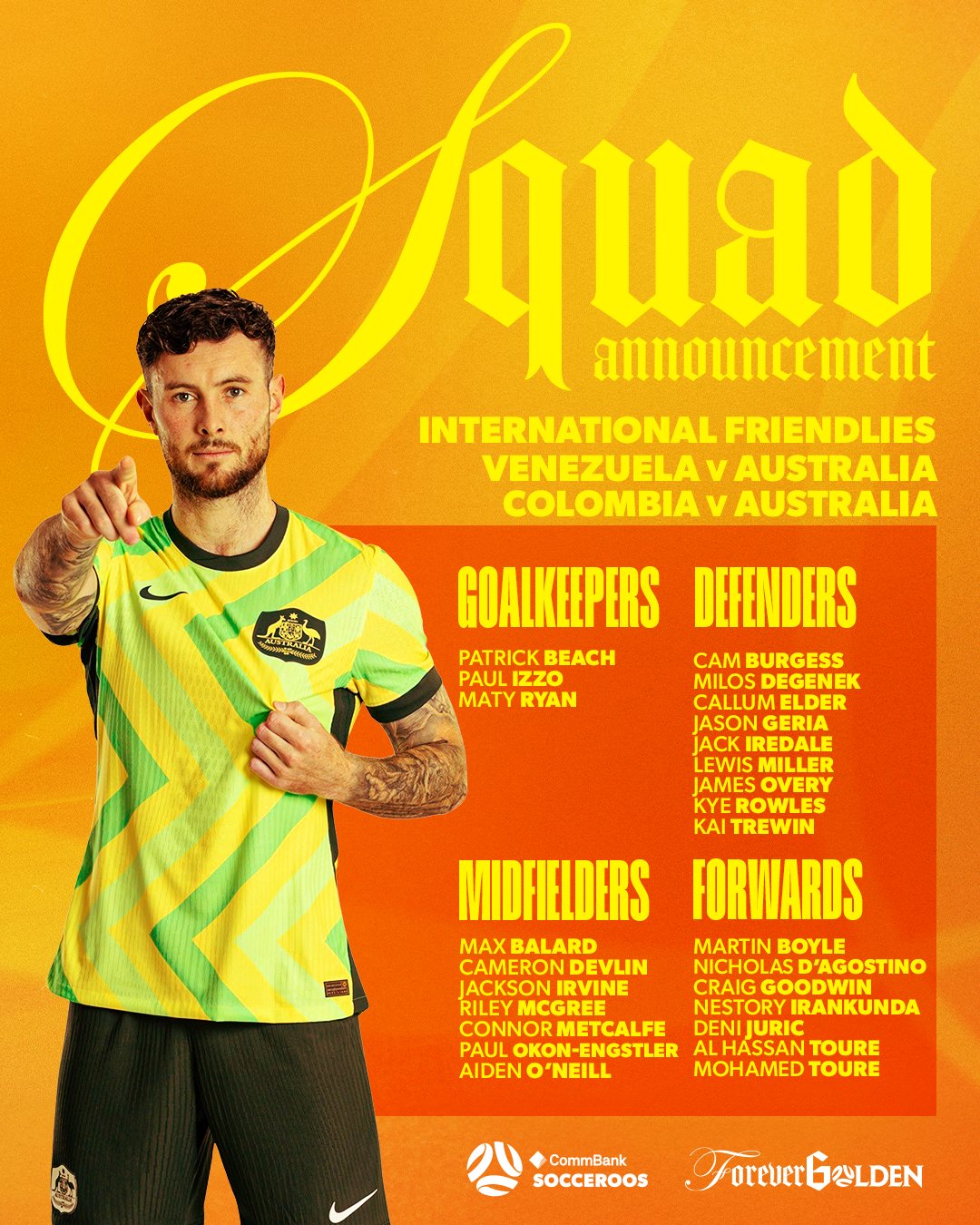 6686 स्पोर्ट्स ने 7 नवंबर को रिपोर्ट दी कि ऑस्ट्रेलियाई राष्ट्रीय टीम ने एक नए रोस्टर की घोषणा की है। नवंबर में टीम वेनेजुएला और कोलंबिया से भिड़ेगी। सूची में गुडविन, बॉयल, इरविंग और अन्य प्रसिद्ध खिलाड़ी शामिल हैं।
