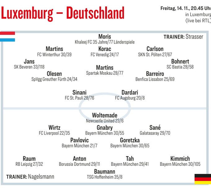 6686 स्पोर्ट्स ने 13 नवंबर को रिपोर्ट दी कि विश्व कप क्वालीफाइंग टूर्नामेंट के यूरोपीय ग्रुप चरण में, जर्मन टीम घर से दूर लक्ज़मबर्ग टीम को चुनौती देगी। खेल से पहले, जर्मन खेल मीडिया "किकर" ने इस खेल के लिए जर्मन टीम की शुरुआती लाइनअप की भविष्यवाणी की थी। उनमें से, नंबर 5 वाल्टर मैडर, जो न्यूकैसल के लिए खेलते हैं, एकल तीर की स्थिति में दिखाई देते हैं। विर्त्ज़, जिन्होंने लिवरपूल में संघर्ष किया था, को शुरुआती अवसर मिला और वे बाईं ओर आगे की स्थिति में दिखाई दिए। राष्ट्रीय टीम में वापसी करने वाले साने सही फॉरवर्ड पोजीशन में दिखे।
