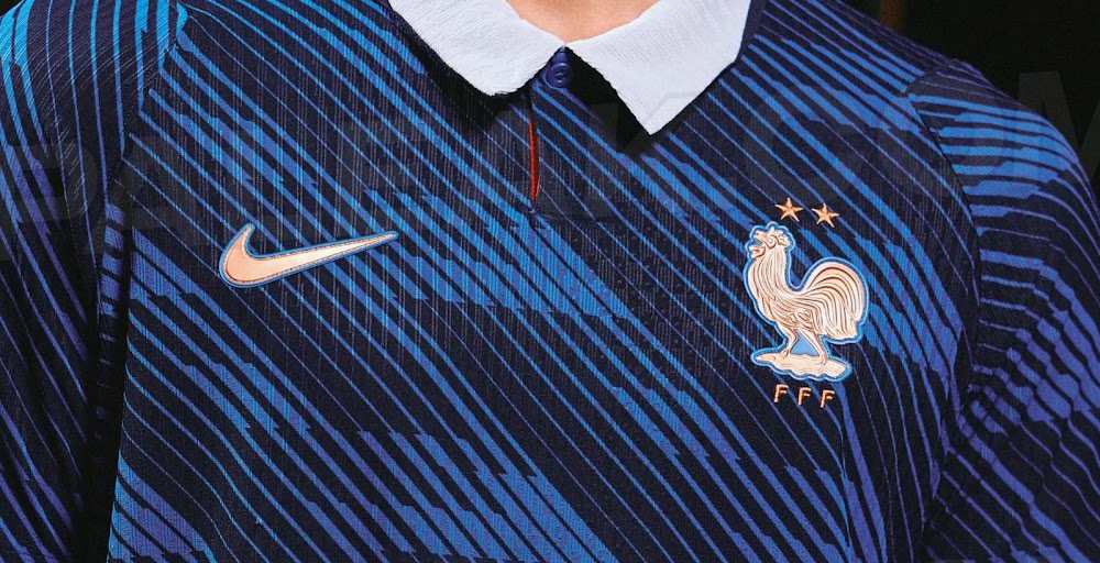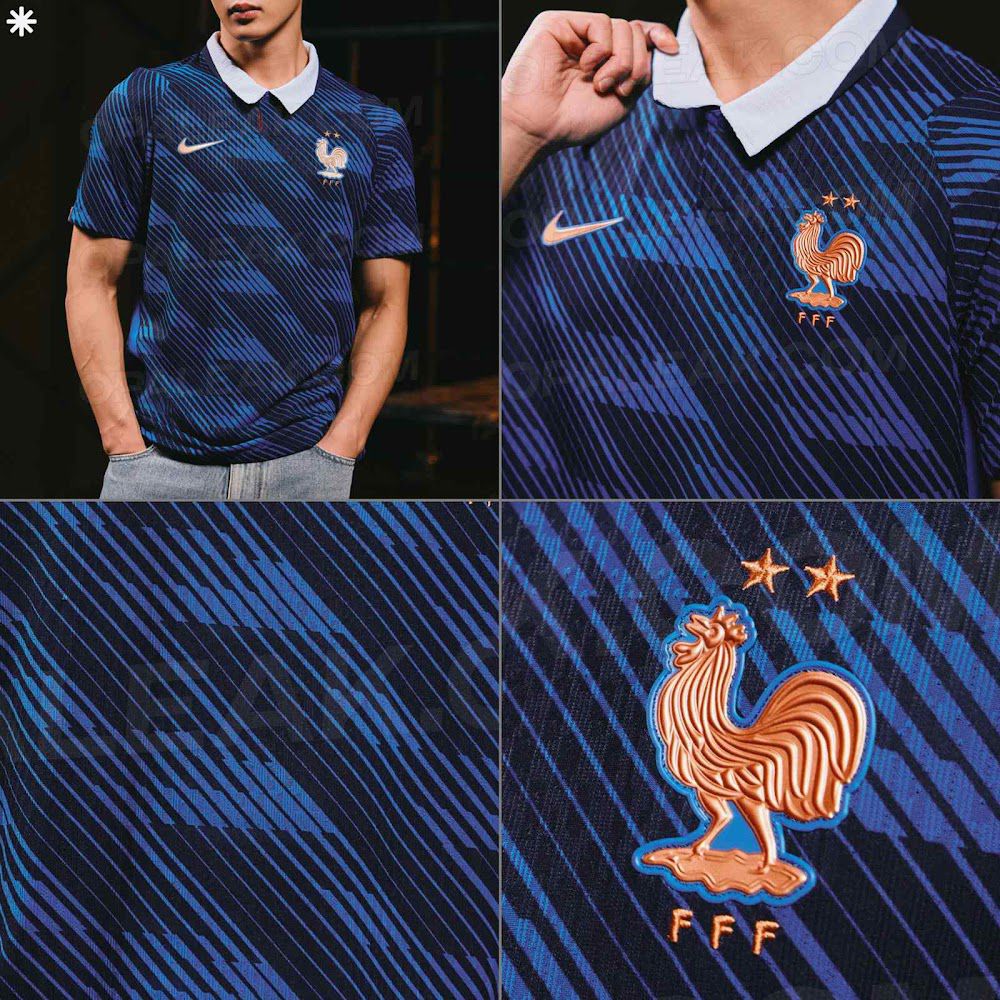 टीम की वर्दी गहरे नीले रंग के फुल-बॉडी पैटर्न को अपनाती है और इसमें फ्रेंच फुटबॉल फेडरेशन (एफएफएफ) के तत्व शामिल हैं। नेकलाइन एक आधुनिक पोलो कॉलर है, जिसमें सामने सफेद और पीछे गहरा नीला रंग है, जिसमें कॉलर के बंद होने पर लाल विवरण छिपा हुआ है।