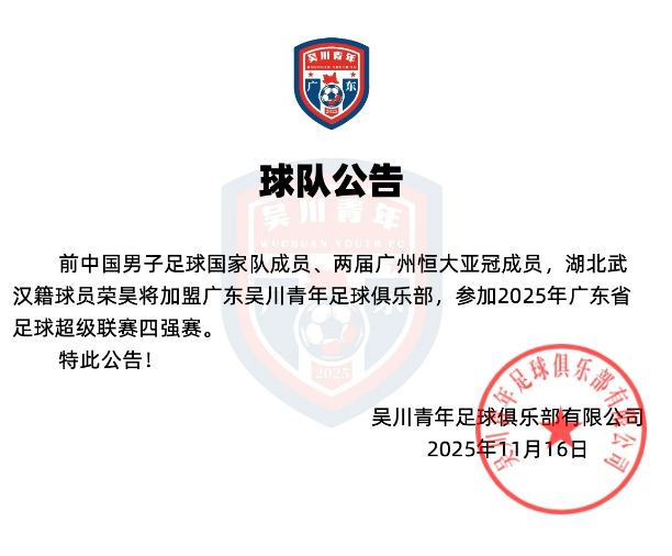 6686 स्पोर्ट्स ने 16 नवंबर को रिपोर्ट दी कि ग्वांगडोंग वुचुआन यूथ फुटबॉल क्लब ने घोषणा की कि 38 वर्षीय पूर्व अंतरराष्ट्रीय रोंग हाओ आधिकारिक तौर पर शामिल हो गए हैं।