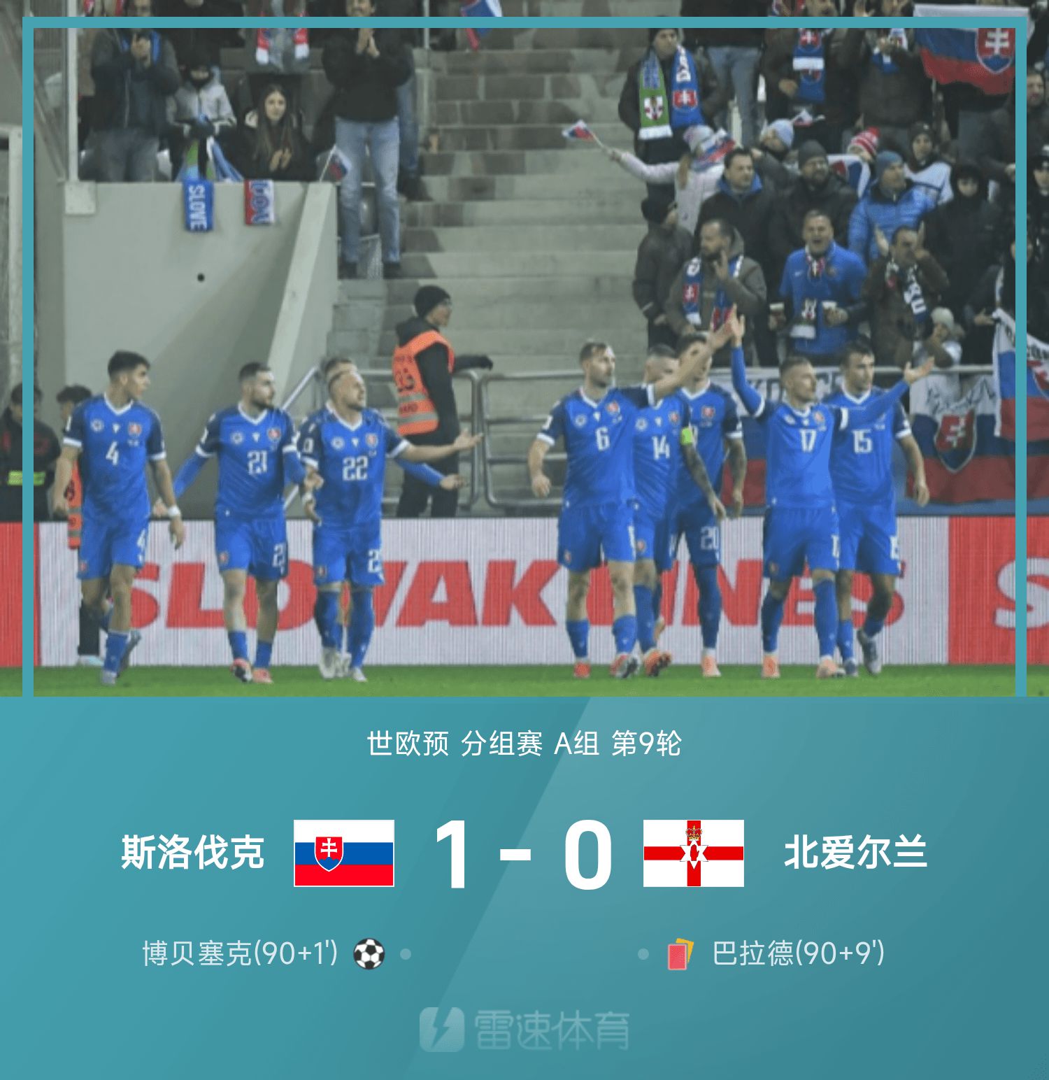 6686 खेल समाचार 15 नवंबर को 26वें विश्व यूरोपीय क्वालीफायर के ग्रुप ए के 9वें दौर में, स्लोवाक की घरेलू टीम ने उत्तरी आयरलैंड को 1-0 से हराया। खेल के दूसरे भाग में स्लोवाकिया के दो गोल अस्वीकार कर दिये गये। रुकने के समय में, बोबेसेक ने आखिरी शॉट भेजा, और फिर बैलार्ड को बाहर भेज दिया गया, जिससे उत्तरी आयरलैंड में चुनौती के लिए केवल 10 खिलाड़ी बचे। जर्मनी और स्लोवाकिया दोनों ने 4 जीत और 1 हार के साथ 12 अंक बनाए। विश्व कप फाइनल में सीधे जगह बनाने के लिए दोनों टीमें अंतिम दौर में सीधे आमने-सामने होंगी।
