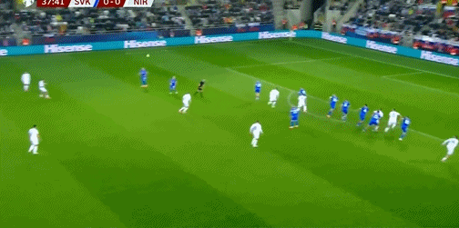 16' उत्तरी आयरलैंड का फ्री किक तीन सेकंड के क्षेत्र में चला गया, और 12-यार्डर गेंद से चूक गया