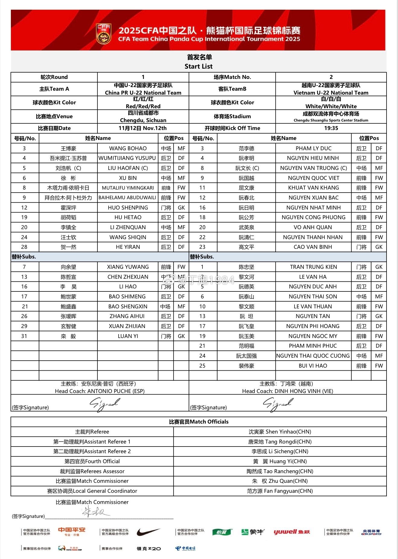 चीन U22 की शुरुआती लाइनअप:12-हुओ शेनपिंग, 24-वांग शिकिन, 28-हे यिरान, 5-लियू हाओफान, 4-वुमितिजियांग, 20-ली झेनक्वान, 6-जू बिन, 19-हू हेताओ, 8-मुता लिपु, 3-वांग बोहाओ, 9-बाइहे लामू