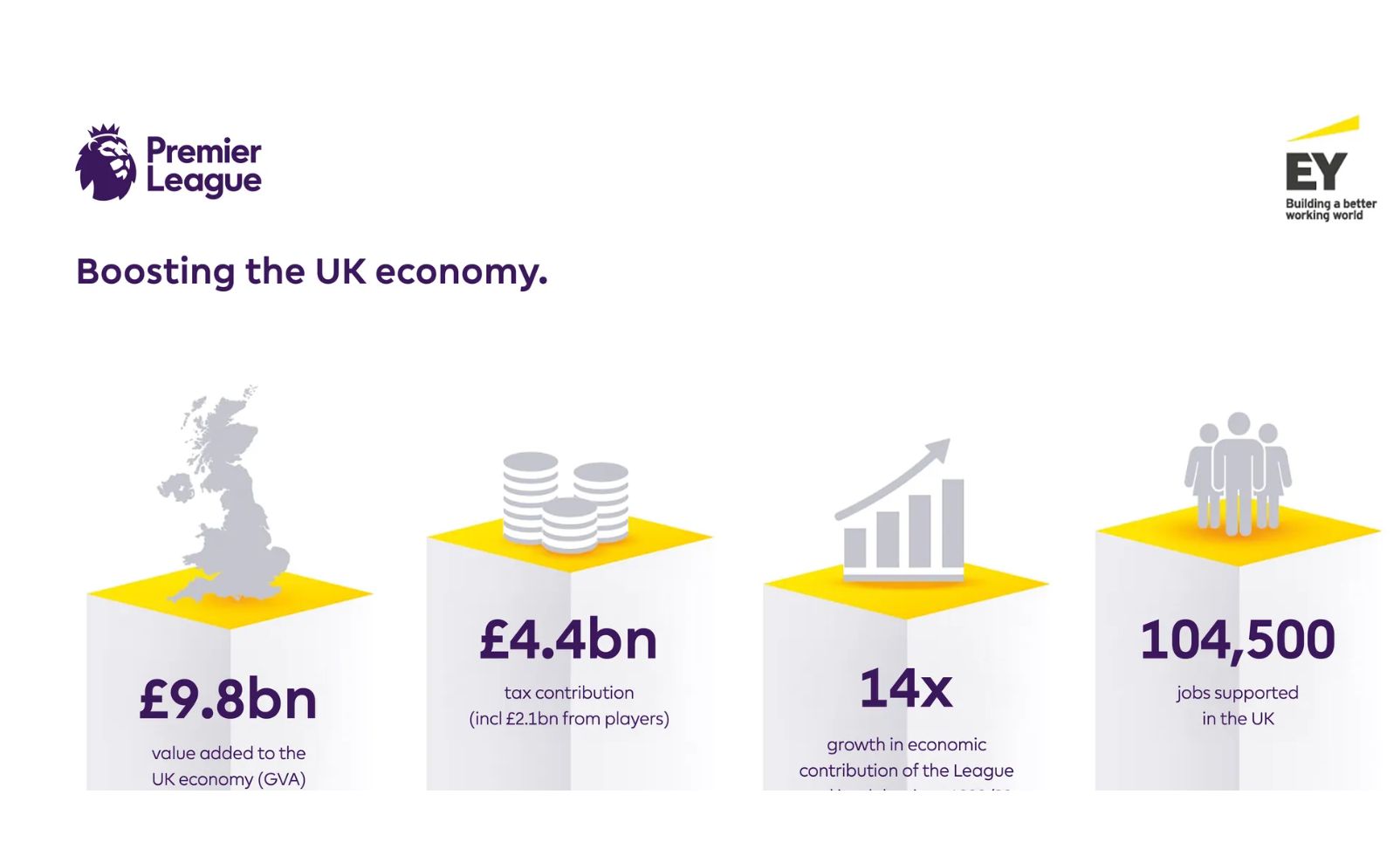 2023/24 सीज़न के लिए अर्न्स्ट एंड यंग के आकलन से पता चलता है कि प्रीमियर लीग और उसके क्लबों ने ब्रिटिश अर्थव्यवस्था के लिए 9.8 बिलियन पाउंड का अतिरिक्त मूल्य बनाया है। यह 2021/22 सीज़न की तुलना में 21% की वृद्धि है और 1998/99 सीज़न की तुलना में 14 गुना से अधिक है। शोध में यह भी पाया गया कि प्रीमियर लीग मैच 100,000 से अधिक पूर्णकालिक नौकरियों का समर्थन करते हैं और करों में £4.4 बिलियन का योगदान करते हैं, जिसमें खिलाड़ियों और कर्मचारियों से प्राप्त £2.1 बिलियन भी शामिल है - राजस्व जो पूरे यूके में सार्वजनिक सेवाओं को वित्तपोषित करने में मदद करता है।