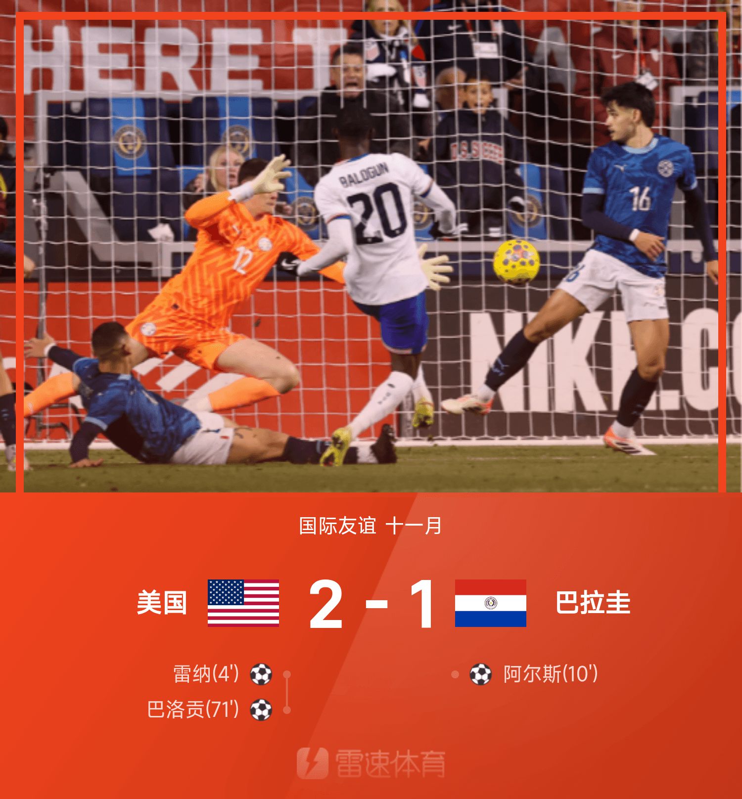 6686 स्पोर्ट्स ने 16 नवंबर को रिपोर्ट दी कि अंतरराष्ट्रीय मैत्री मैच में द्वंद्व की शुरुआत हुई, अमेरिकी घरेलू टीम का सामना पराग्वे से हुआ। संयुक्त राज्य अमेरिका की टीम के लिए, बालोगुन और रीना ने क्रमशः गोल किए, जबकि पराग्वे के लिए, एल्स ने स्कोर किया और खेल को बचाने में असफल रहे। अंत में, संयुक्त राज्य अमेरिका ने पराग्वे को 2-1 से हरा दिया।