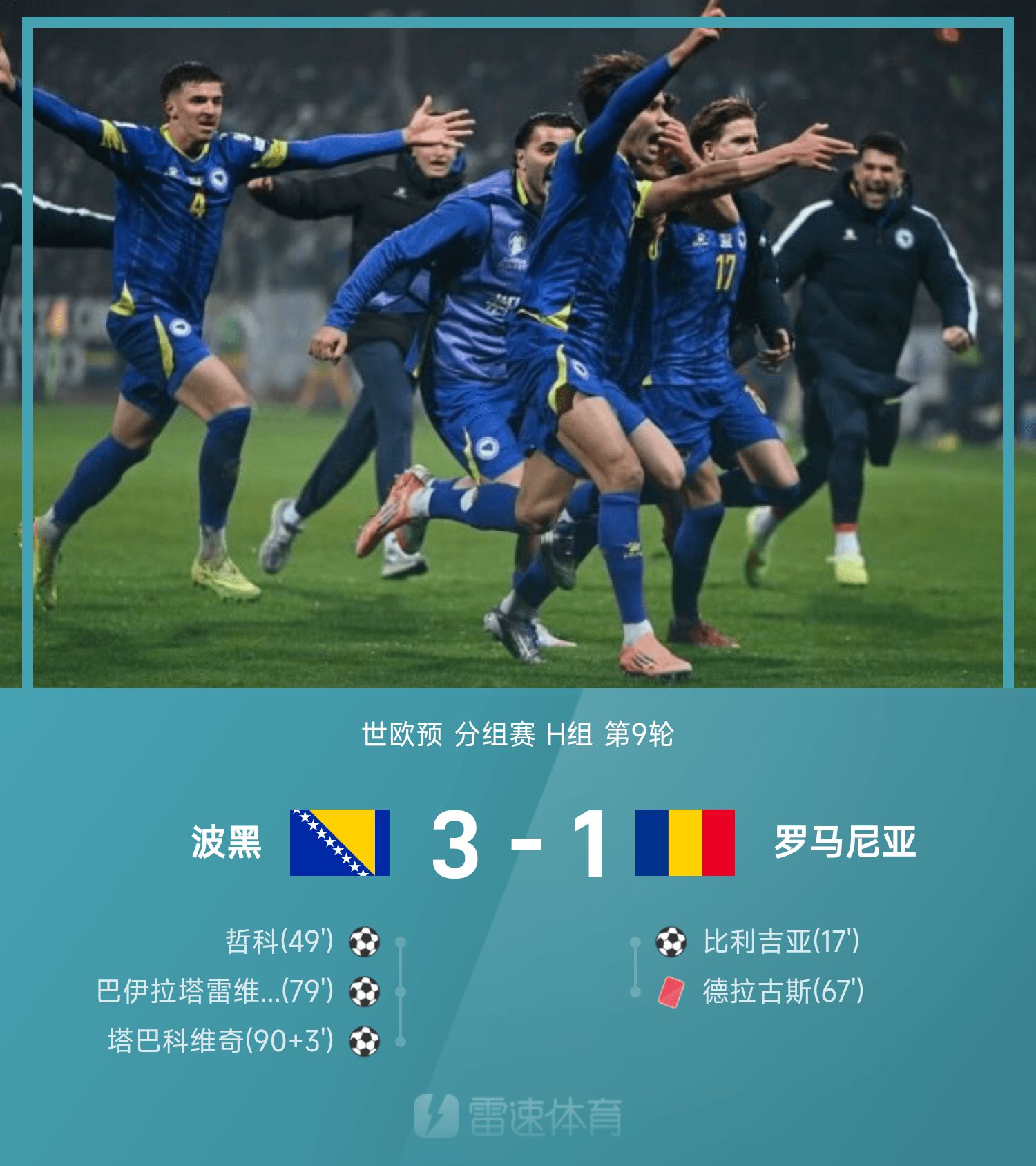 6686 स्पोर्ट्स ने 16 नवंबर को बताया कि 26वें विश्व यूरोपीय क्वालीफायर के ग्रुप एच के 9वें दौर में, बोस्निया और हर्जेगोविना का सामना घरेलू मैदान पर रोमानिया से हुआ। पहले हाफ में रोमानिया की शुरुआत शानदार रही और विलगिया ने गोल किया। दूसरे हाफ में बोस्निया और हर्जेगोविना ने अपनी ताकत लगानी शुरू की और डेजेको ने गोलकीपर की सर्विस तोड़कर बराबरी कर ली. खेल के दो मिनट बाद ड्रैगस को नियमों के गंभीर उल्लंघन के लिए बाहर भेज दिया गया। रोमानिया के दस लोगों ने बोस्निया और हर्जेगोविना का सामना किया। 79वें मिनट में बाजलातारेविच ने गोल करके स्थिति पलट दी और तबाकोविक ने गोल करके गेम अपने नाम कर लिया। विलगिया गोल करने और सेवियर को बचाने में असफल रहा। अंत में, बोस्निया और हर्जेगोविना ने दस सदस्यीय रोमानिया को 3-1 से हराया।