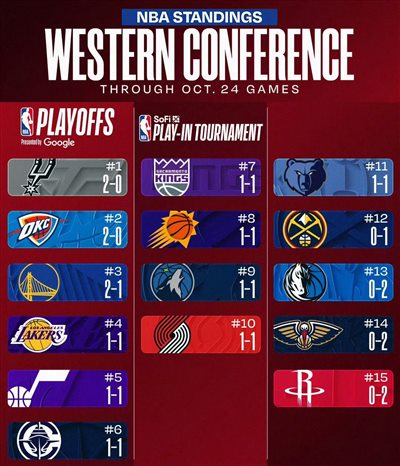 वर्तमान में, नए सीज़न के पहले दो मैचों के बाद, रॉकेट्स, मावेरिक्स और पेलिकन को जीतना मुश्किल है और वेस्टर्न कॉन्फ्रेंस में अंतिम स्थान पर हैं, जबकि स्पर्स और गत चैंपियन थंडर 2 जीत और 0 हार के रिकॉर्ड के साथ वेस्टर्न कॉन्फ्रेंस में सबसे आगे हैं।