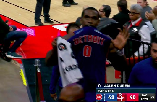 दूसरे क्वार्टर में 6 मिनट से अधिक समय तक आमीन और ड्यूरेन के बीच एक के बाद एक विवाद होते रहे. पहली बार, आमीन ने जानबूझकर ड्यूरेन का उल्लंघन किया, और बाद वाले ने आमीन को दूर धकेल दिया और तकनीकी उल्लंघन प्राप्त किया। जल्द ही दोनों फिर से मिले और ड्यूरेन की कोहनी सीधे आमीन के चेहरे पर लगी। रेफरी ने रीप्ले के बाद सीधे ड्यूरेन को निष्कासित कर दिया, जिससे उसे दूसरे स्तर का दुर्भावनापूर्ण उल्लंघन मिला।