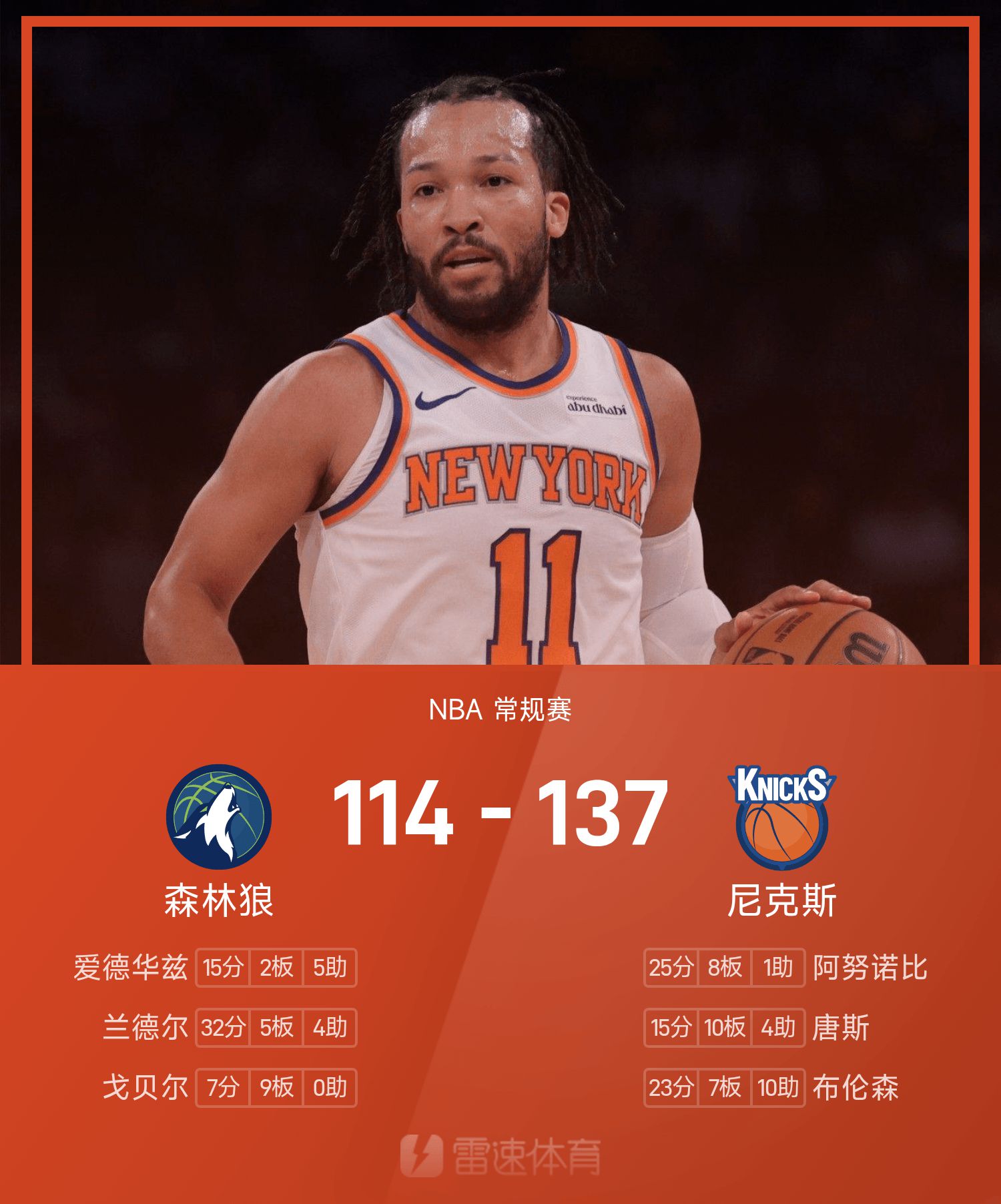 खेल के अंत में, निक्स ने टिम्बरवॉल्व्स को 137-114 से हरा दिया।