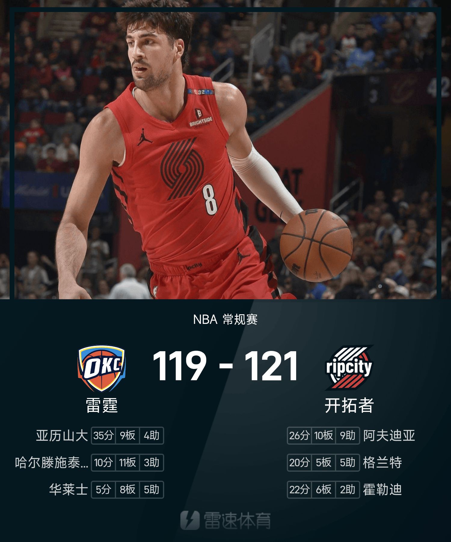 6686 खेल नवंबर 06 समाचार 25/26 एनबीए नियमित सीज़न में, ट्रेल ब्लेज़र्स ने थंडर के खिलाफ खेला। खेल के अंत में ट्रेल ब्लेज़र्स ने थंडर को 121-119 से हराया। अवदिजा ने 26 अंक, 10 रिबाउंड और 9 सहायता करके टीम को जीत दिलाई। अलेक्जेंडर ने गेम में सर्वाधिक 35 अंक, 9 रिबाउंड और 4 सहायता अर्जित की।
