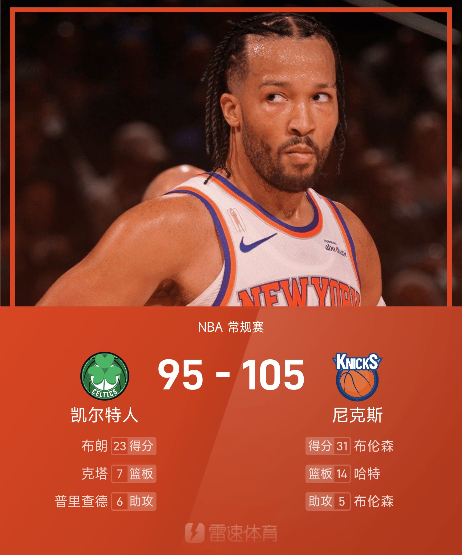6686 खेल 25 अक्टूबर 25/26 NBA नियमित सीज़न में, निक्स ने सेल्टिक्स का सामना किया। खेल के अंत में, निक्स ने सेल्टिक्स को 105-95 से हराया। ब्रूनसन ने गेम में सर्वाधिक 31 अंक, 3 रिबाउंड और 5 सहायता अर्जित की, जिससे निक्स को जीत मिली।