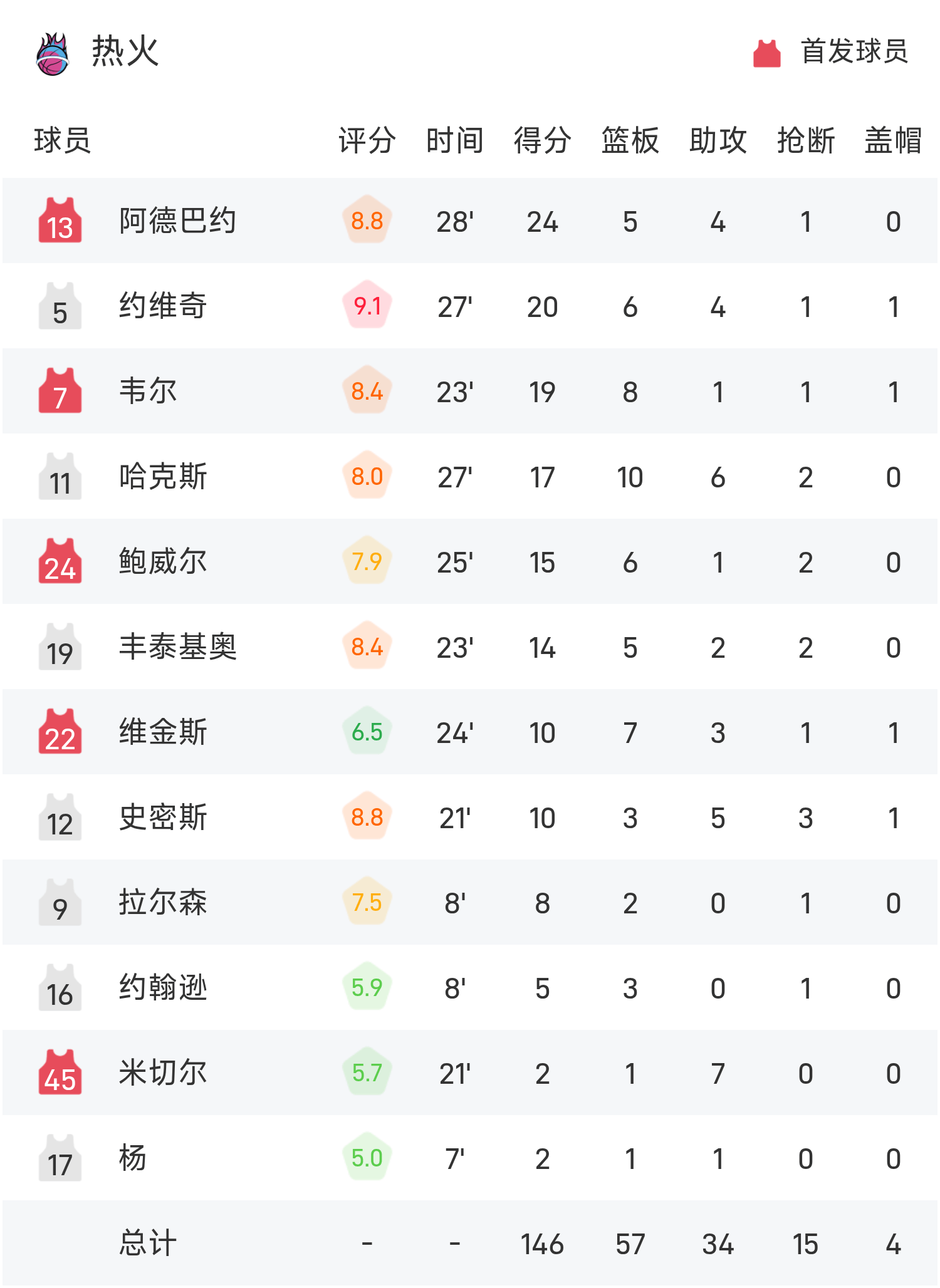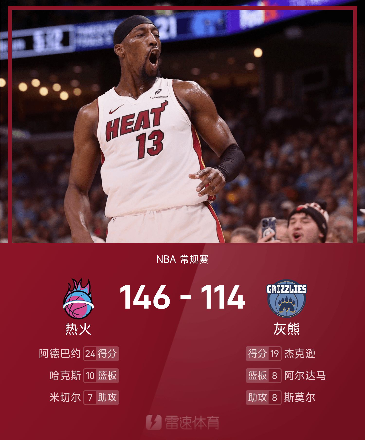 6686 स्पोर्ट्स, 25 अक्टूबर 25/26 NBA नियमित सीज़न में, ग्रिज़लीज़ को हीट का सामना करना पड़ा। खेल के अंत में, ग्रिज़लीज़ हीट 114-146 से हार गए। एडेबायोर ने गेम में सर्वाधिक 24 अंक, 5 रिबाउंड और 4 सहायता हासिल की, जिससे हीट को जीत मिली।