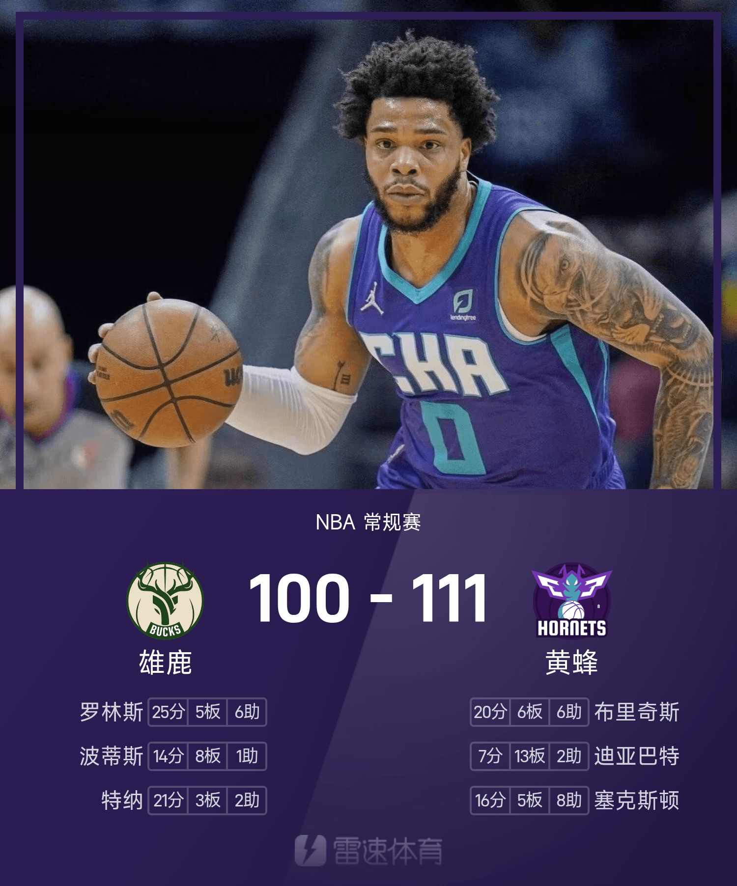खेल के अंत में, हॉर्नेट्स ने बक्स को 111-100 से हरा दिया।