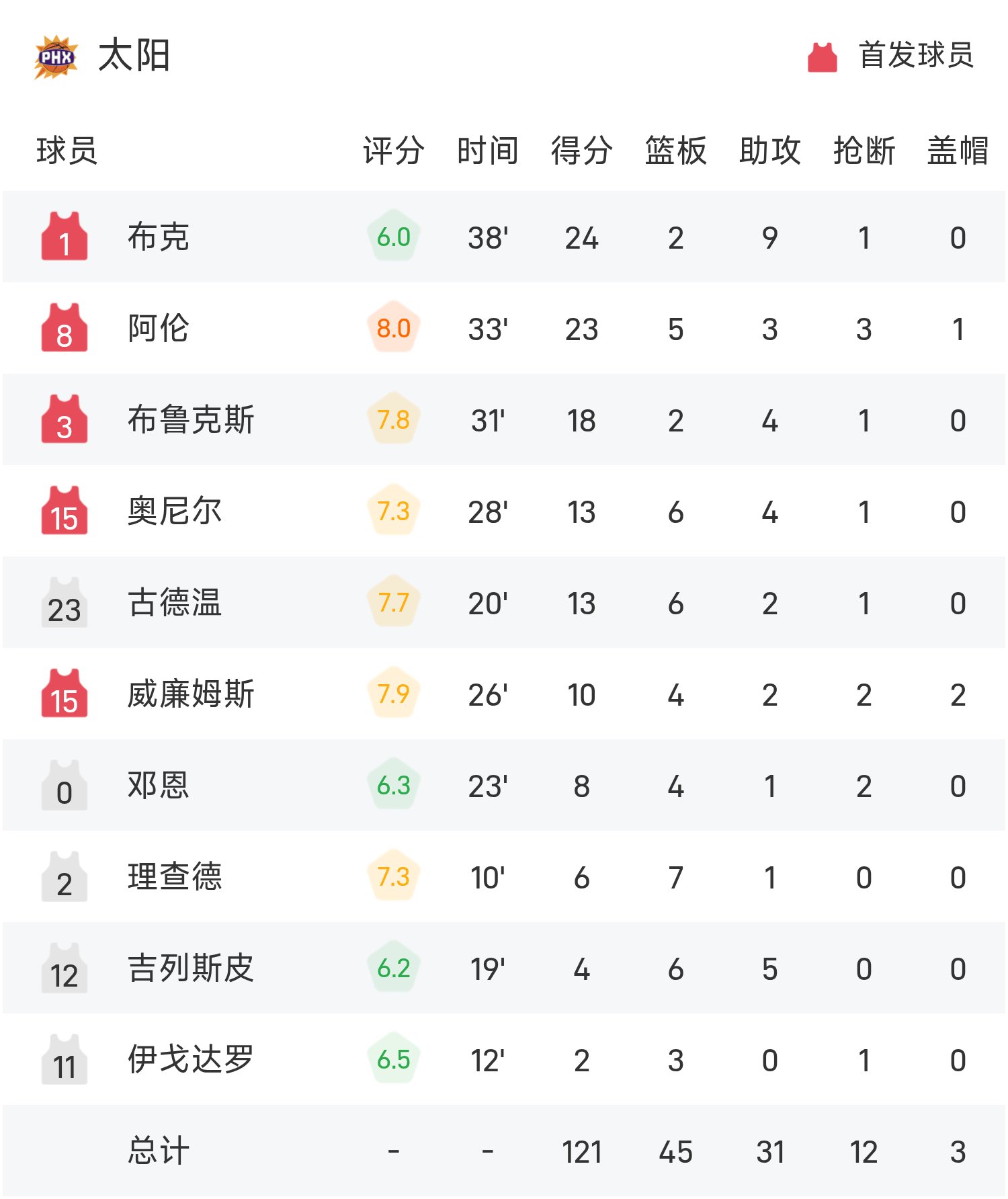 बुकर ने गेम में सर्वाधिक 24 अंक, 2 रिबाउंड और 9 सहायता अर्जित की, जिससे सन्स को जीत मिली।