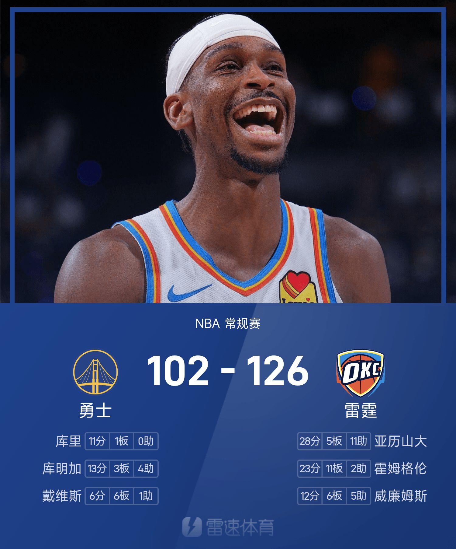 एनबीए रिपोर्ट: अलेक्जेंडर 28 अंक और 11 सहायता, थंडर ने वॉरियर्स को 126-102 से हराया