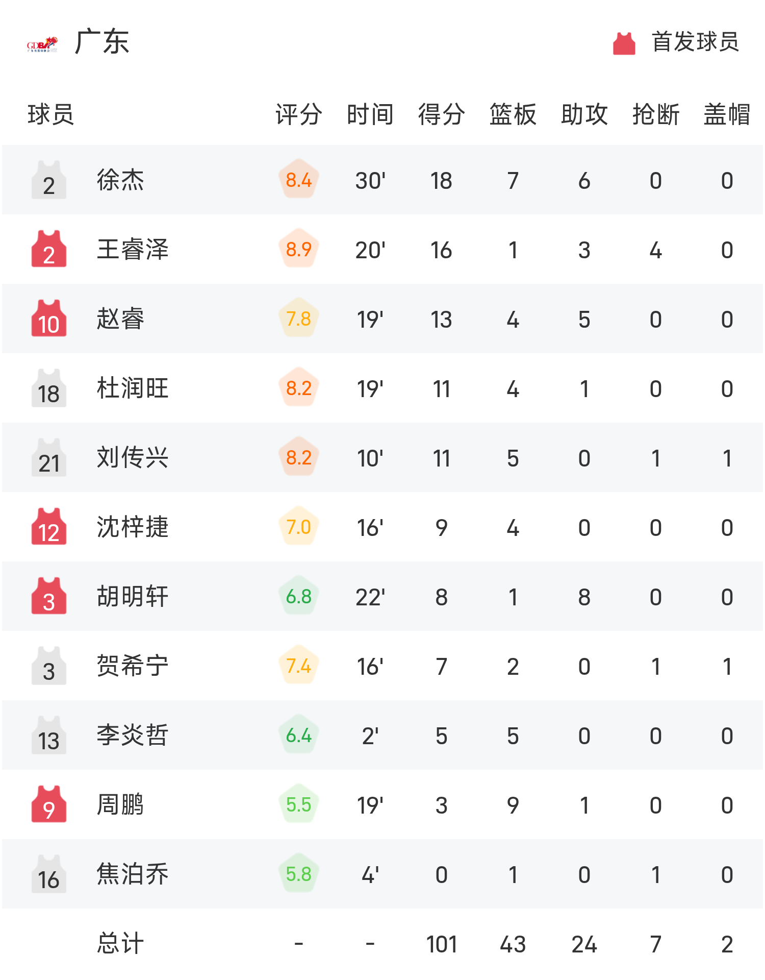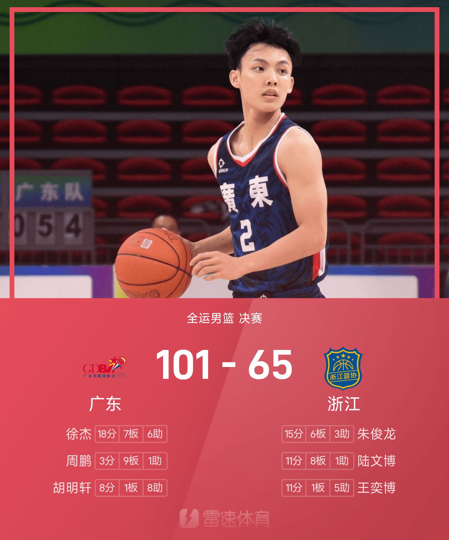 ज़ू जी ने गेम में सर्वाधिक 18 अंक, 7 रिबाउंड और 6 असिस्ट बनाए, जबकि झाओ रुई ने 13 अंक, 4 रिबाउंड और 5 असिस्ट बनाए, जिससे ग्वांगडोंग को जीत मिली और इस राष्ट्रीय खेलों में पुरुष बास्केटबॉल का स्वर्ण पदक जीता।