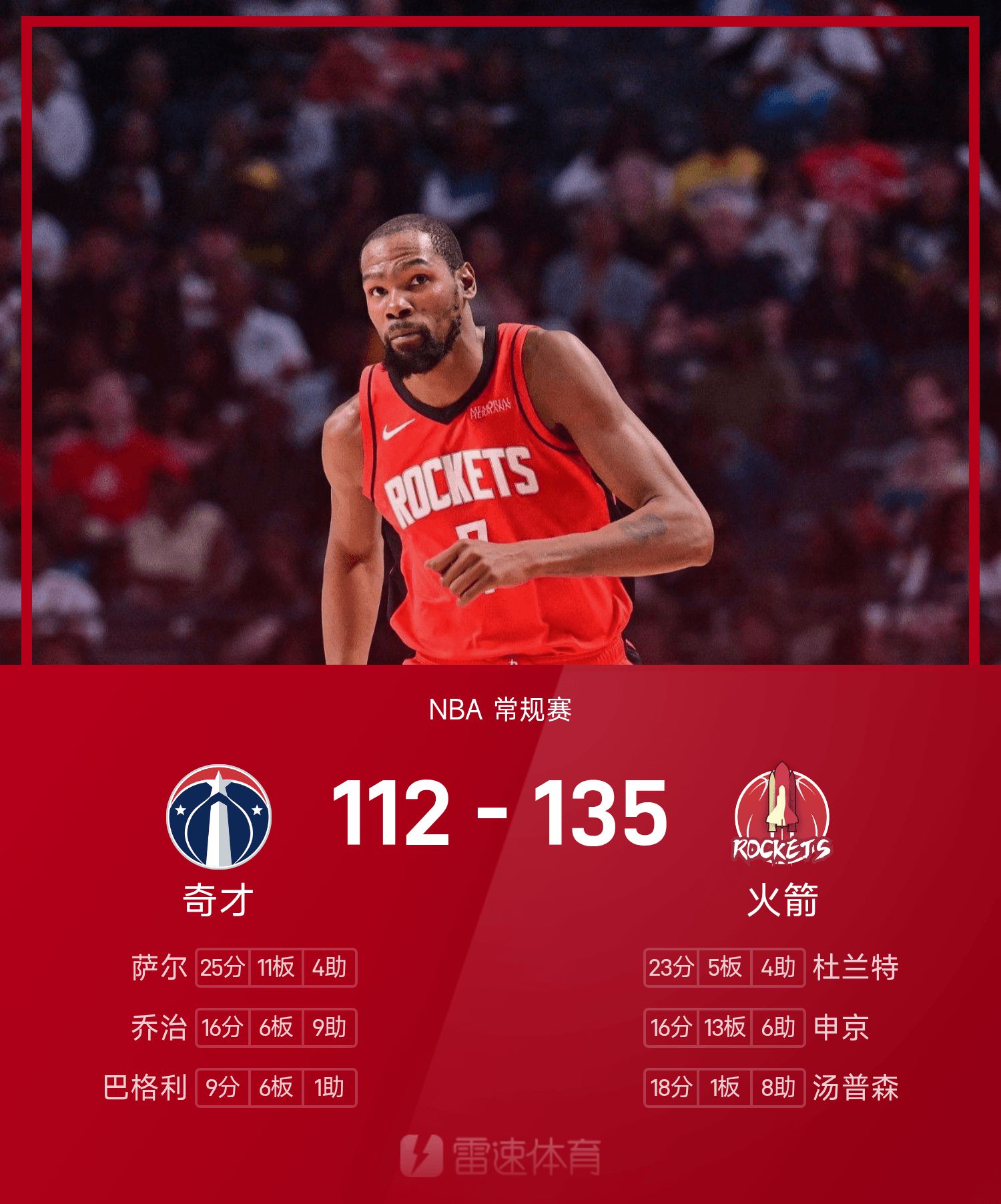 खेल के अंत में रॉकेट्स ने विजार्ड्स को 135-112 से हराया।