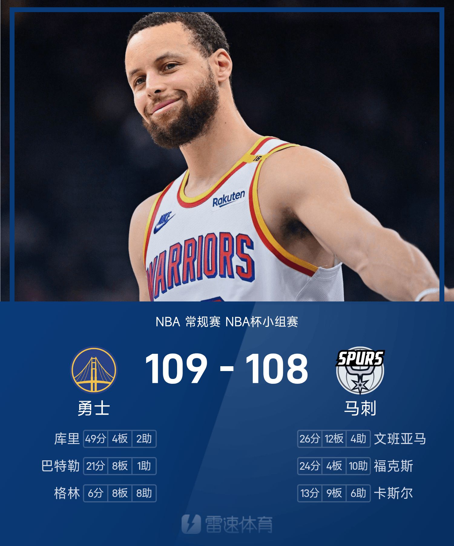 6686 स्पोर्ट्स 15 नवंबर समाचार 25/26 एनबीए नियमित सीज़न एनबीए कप ग्रुप मैच में, स्पर्स का सामना वॉरियर्स से हुआ। खेल के अंत में, स्पर्स वॉरियर्स से 108-109 से हार गए। करी ने गेम में सर्वाधिक 49 अंक, 4 रिबाउंड और 2 सहायता अर्जित की, जिससे वॉरियर्स को जीत मिली।
