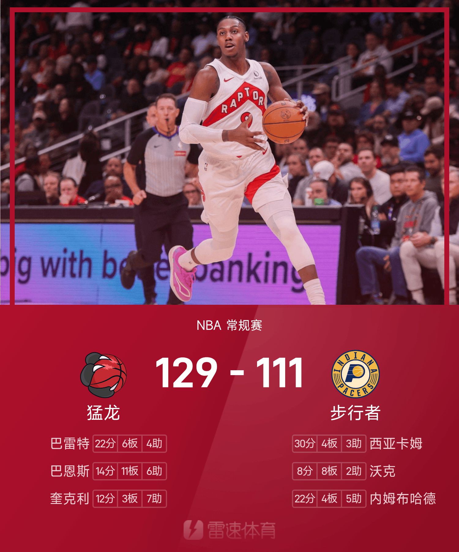 रैप्टर 129-111 पेसर्स