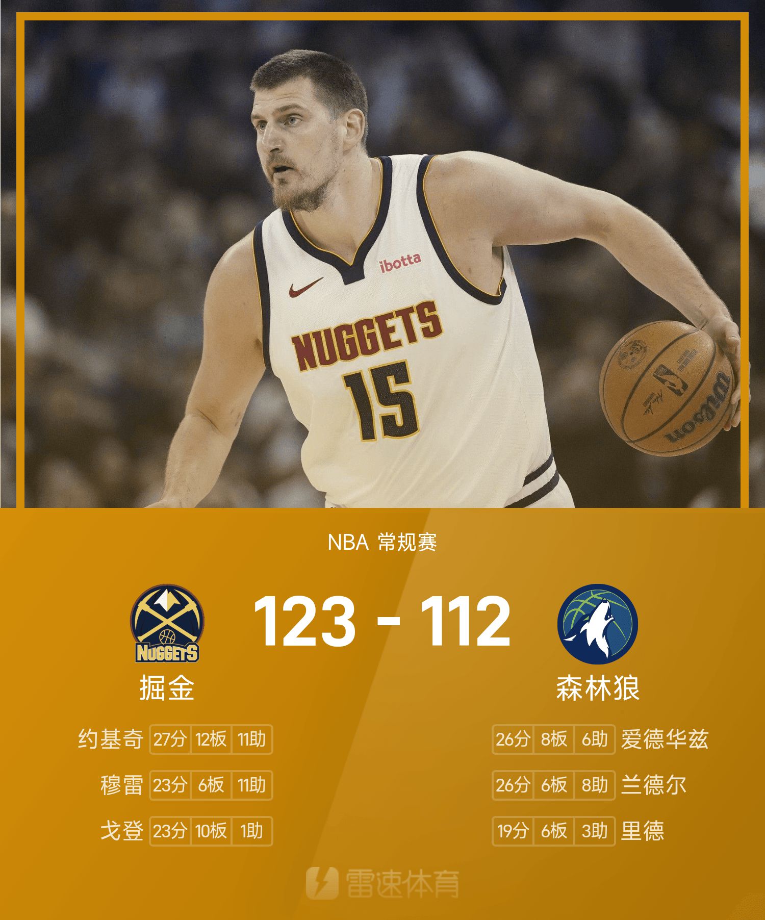जोकिक ने ट्रिपल-डबल में 27 अंक बनाकर नगेट्स को टिम्बरवॉल्व्स पर आसान जीत दिलाई।