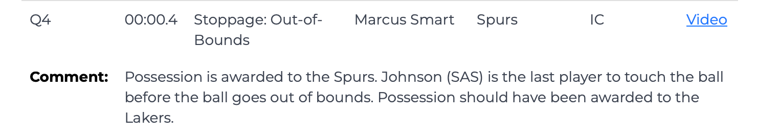 अंतिम 0.4 सेकंड में, गेंद सीमा से बाहर जाने से पहले, केल्डन जॉनसन गेंद को छूने वाले अंतिम व्यक्ति थे, लेकिन रेफरी ने स्मार्ट को बुलाया और गेंद सीमा से बाहर चली गई, और गेंद स्पर्स को दे दी गई। यह एक गलत निर्णय था और गेंद लेकर्स को दी जानी चाहिए थी।
