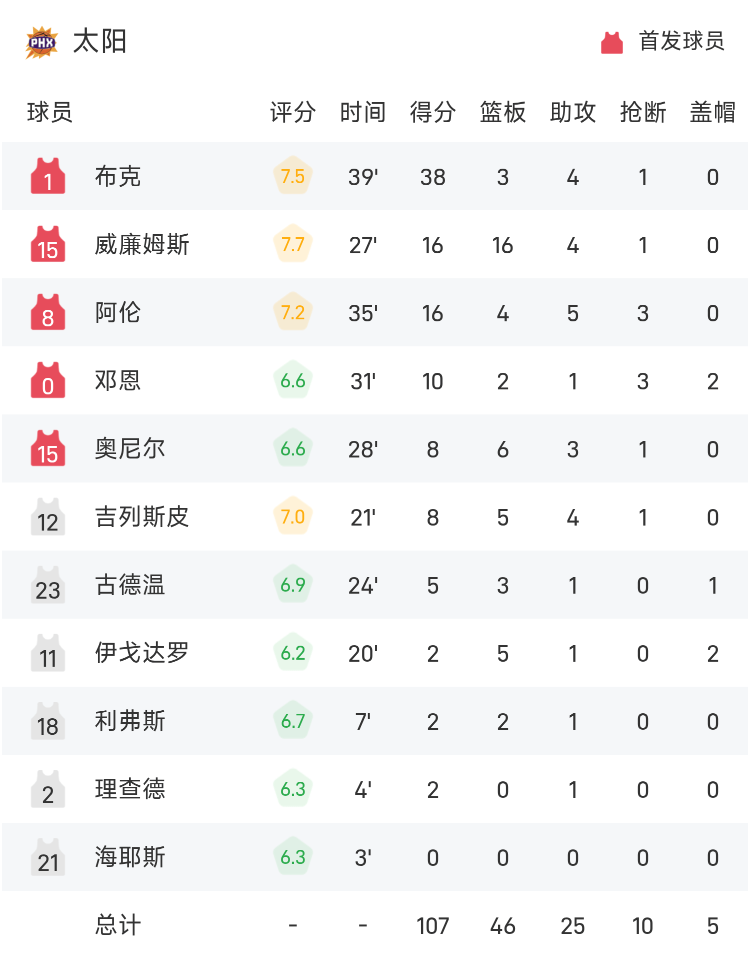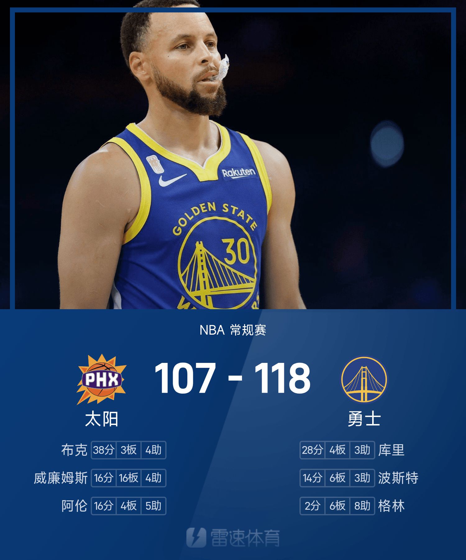 6686 खेल नवंबर 05 समाचार 25/26 NBA नियमित सीज़न में, वॉरियर्स का सामना सन्स से हुआ। खेल के अंत में वॉरियर्स ने सन्स को 118-107 से हरा दिया। करी ने 28 अंक, 4 रिबाउंड और 3 सहायता करके टीम को जीत दिलाई और बुकर ने गेम में सर्वाधिक 38 अंक, 3 रिबाउंड और 4 सहायता की।