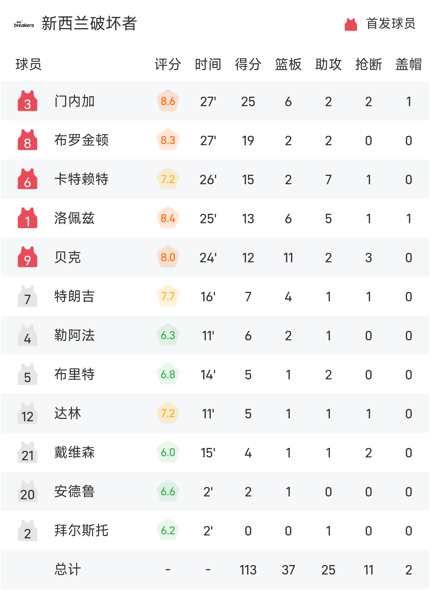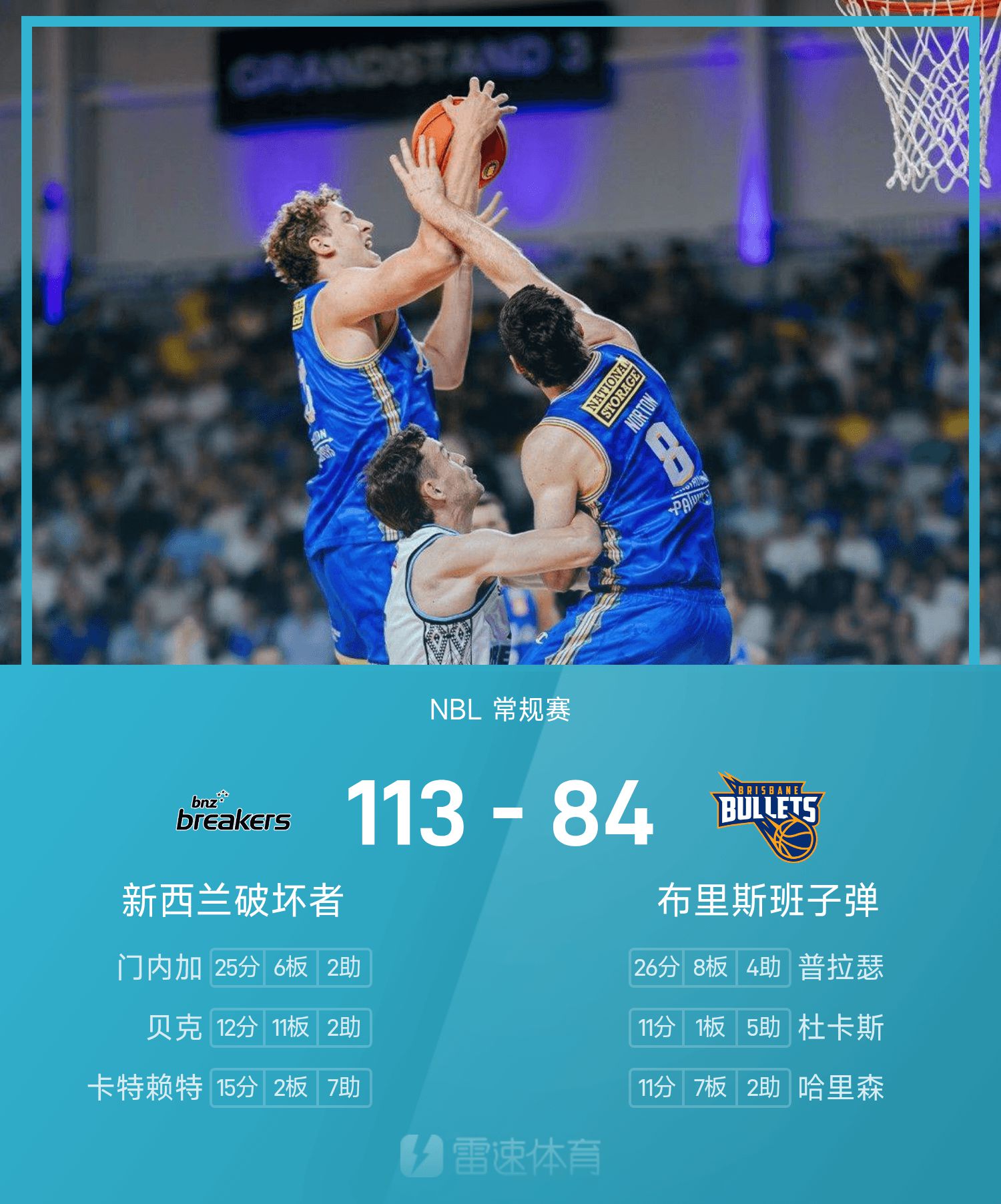 खेल के अंत में, ब्रिस्बेन बुलेट्स न्यूज़ीलैंड डिस्ट्रॉयर्स से 84-113 से हार गए।
