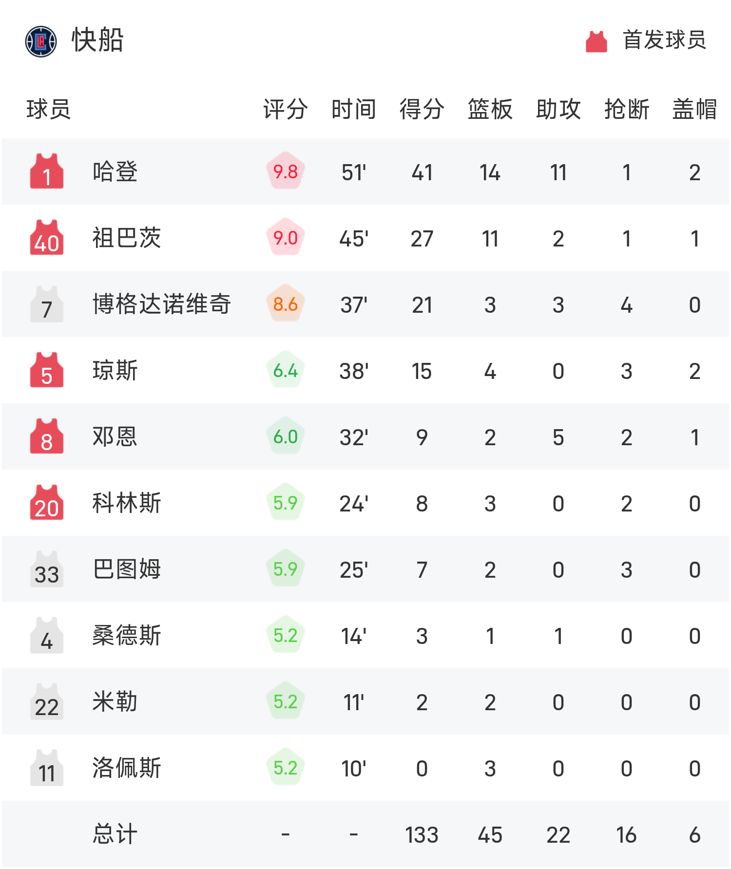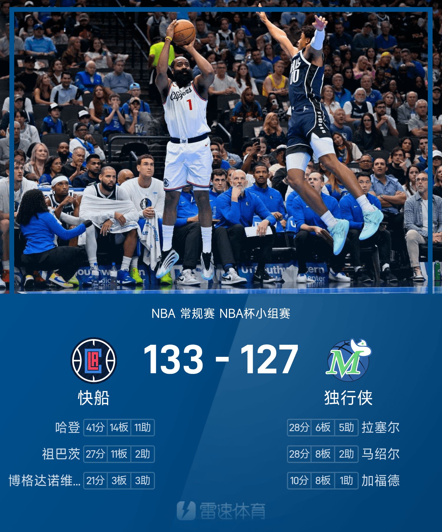 6686 खेल 15 नवंबर समाचार 25/26 एनबीए नियमित सीज़न एनबीए कप ग्रुप मैच में, मावेरिक्स का सामना क्लिपर्स से हुआ। खेल के अंत में, मावेरिक्स क्लिपर्स से 127-133 से हार गया। हार्डन ने गेम में सर्वाधिक 41 अंक, 14 रिबाउंड और 11 सहायताएं हासिल कीं, जिससे क्लिपर्स को जीत मिली।