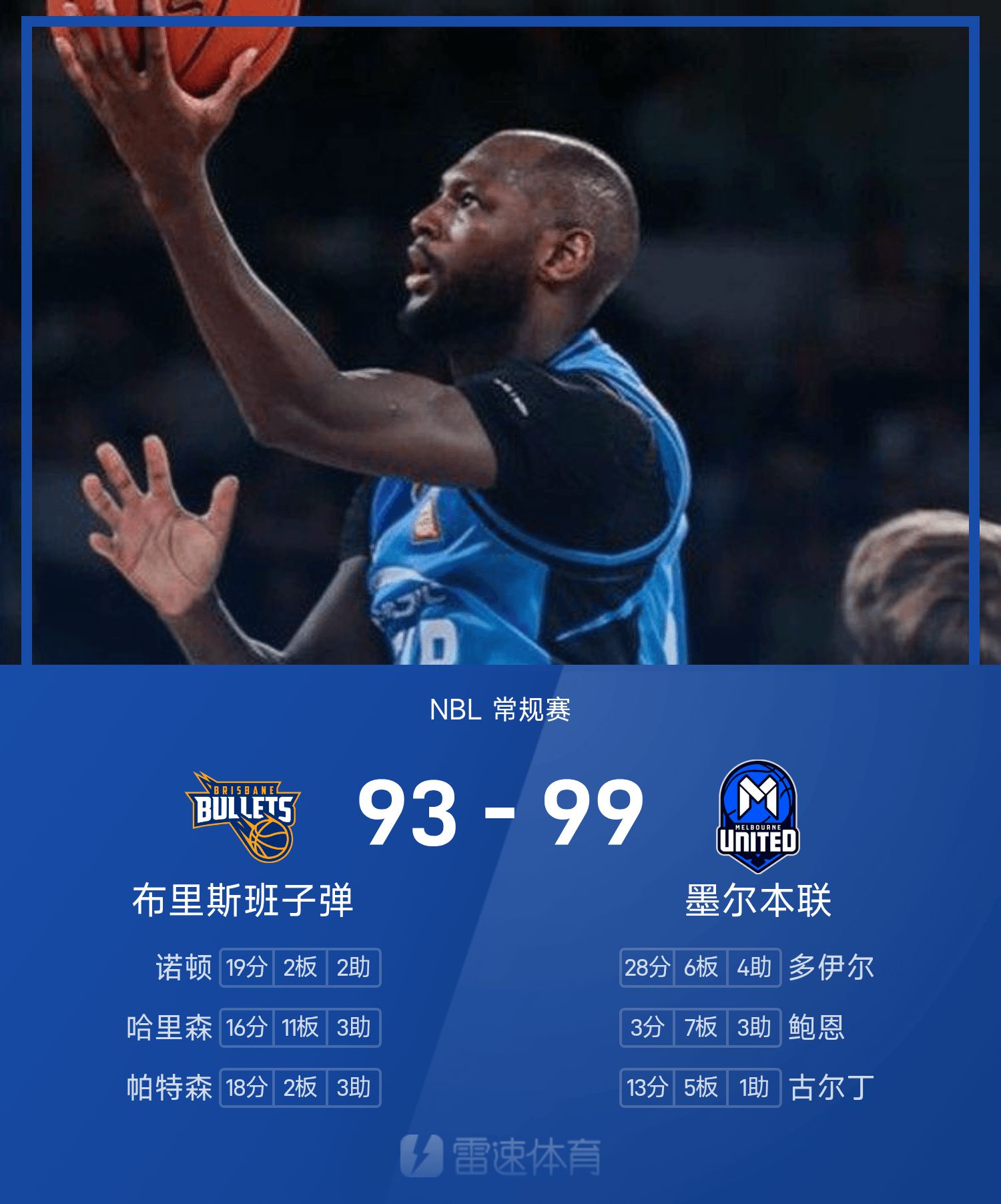 खेल के अंत में मेलबर्न यूनाइटेड ने ब्रिस्बेन बुलेट्स को 99-93 से हरा दिया.