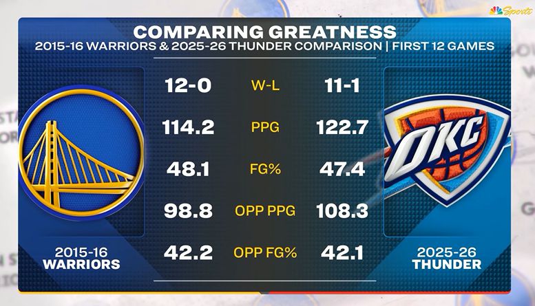 गेम के बाद, अमेरिकी टीवी स्टेशनों ने इस सीज़न के थंडर और 2015-16 वॉरियर्स के पहले 12 गेम के आंकड़ों की तुलना की: