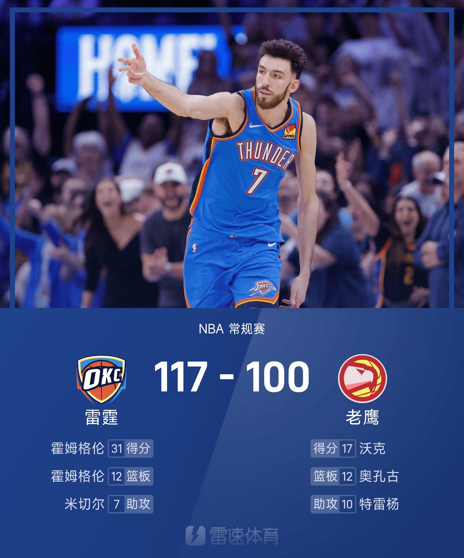 एनबीए रिपोर्ट: होल्मग्रेन 31 अंक और 12 रिबाउंड, थंडर ने हॉक्स को 117-99 से हराया